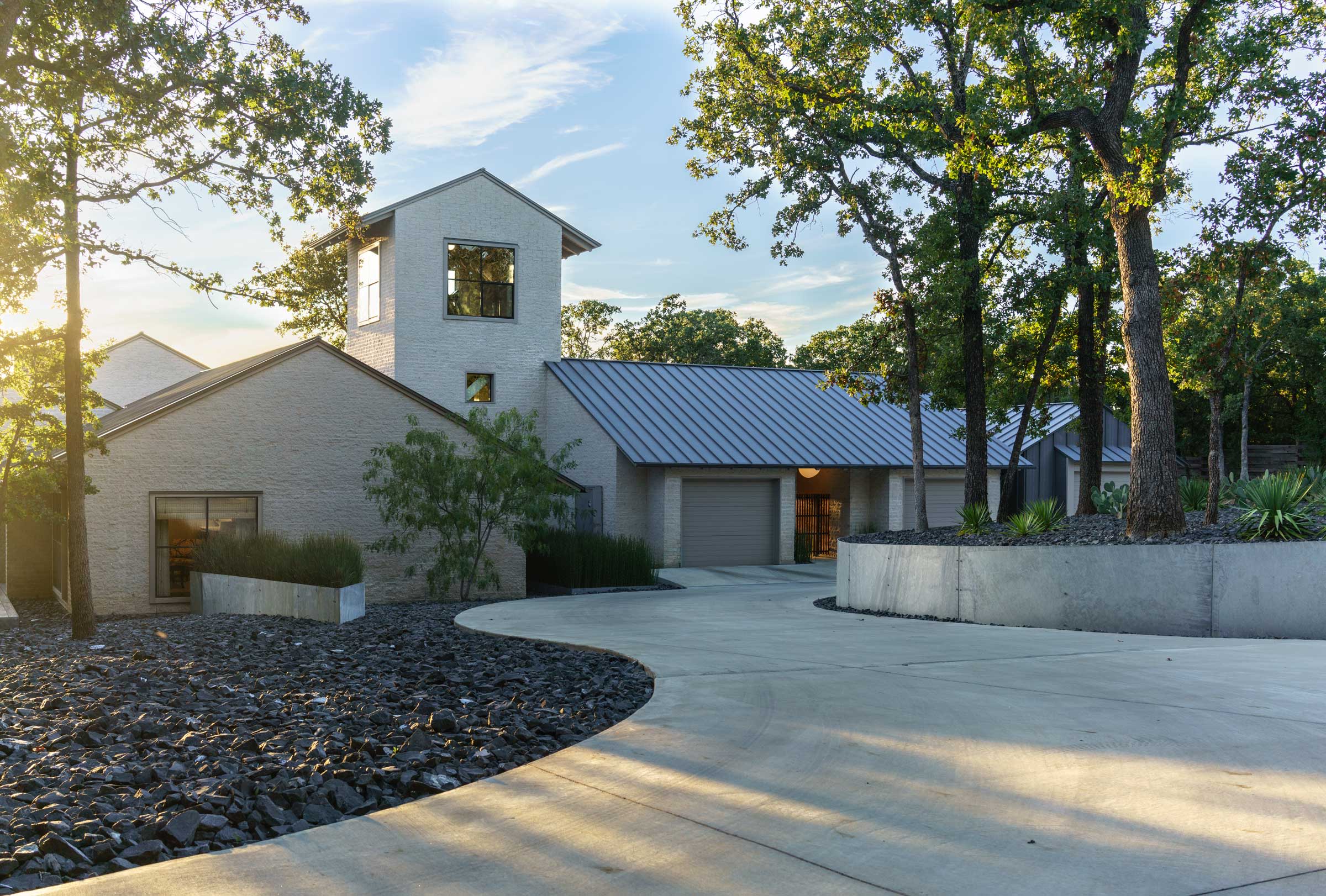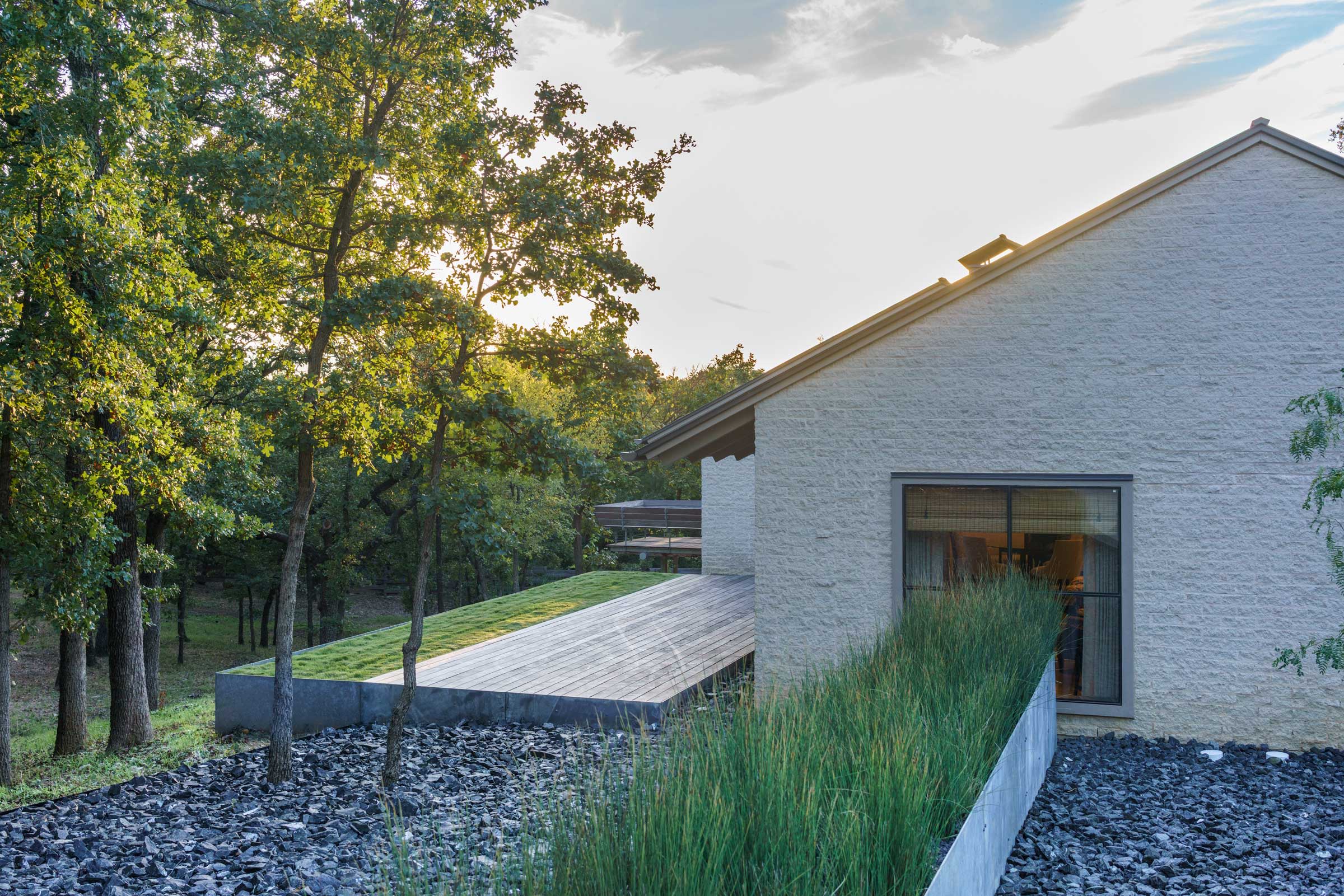 With the site having approximately 30 feet of natural grade change where the house sits, the design solution creates ‘layers of livability’ between the house’s interior space and the raw nature surrounding it.