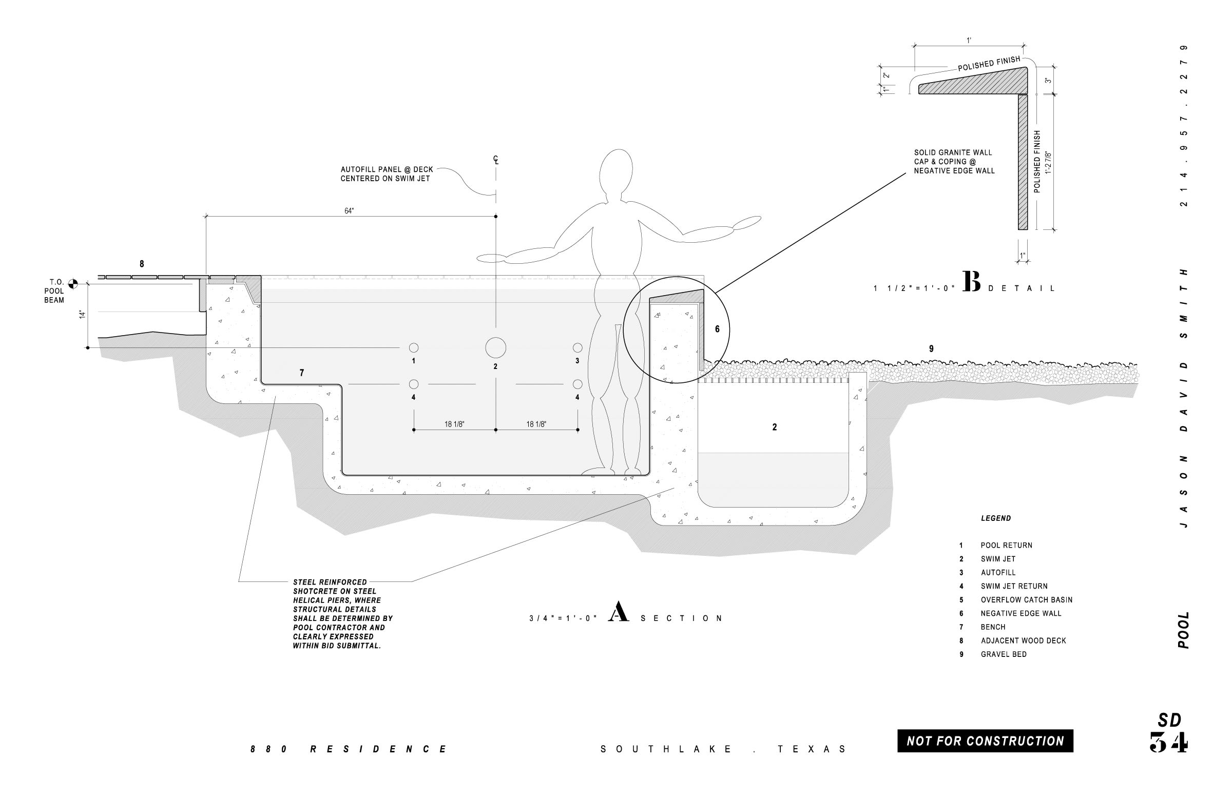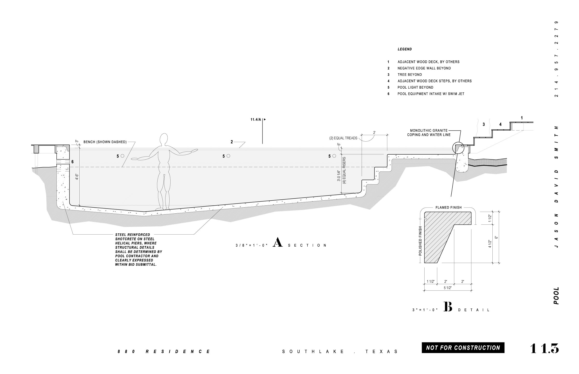 The upper perimeter of the pool is built from large, custom-fabricated pieces of solid granite. The polished tiles of the negative edge provide a crisp smooth surface for the water’s ‘corner’. The monolithic coping uses two different finishes on the same piece to blend with their adjacent materials. The flamed finish on the top matches the wood decking in hue and dimension, and the polished finish at the water line matches the water’s slick surface.