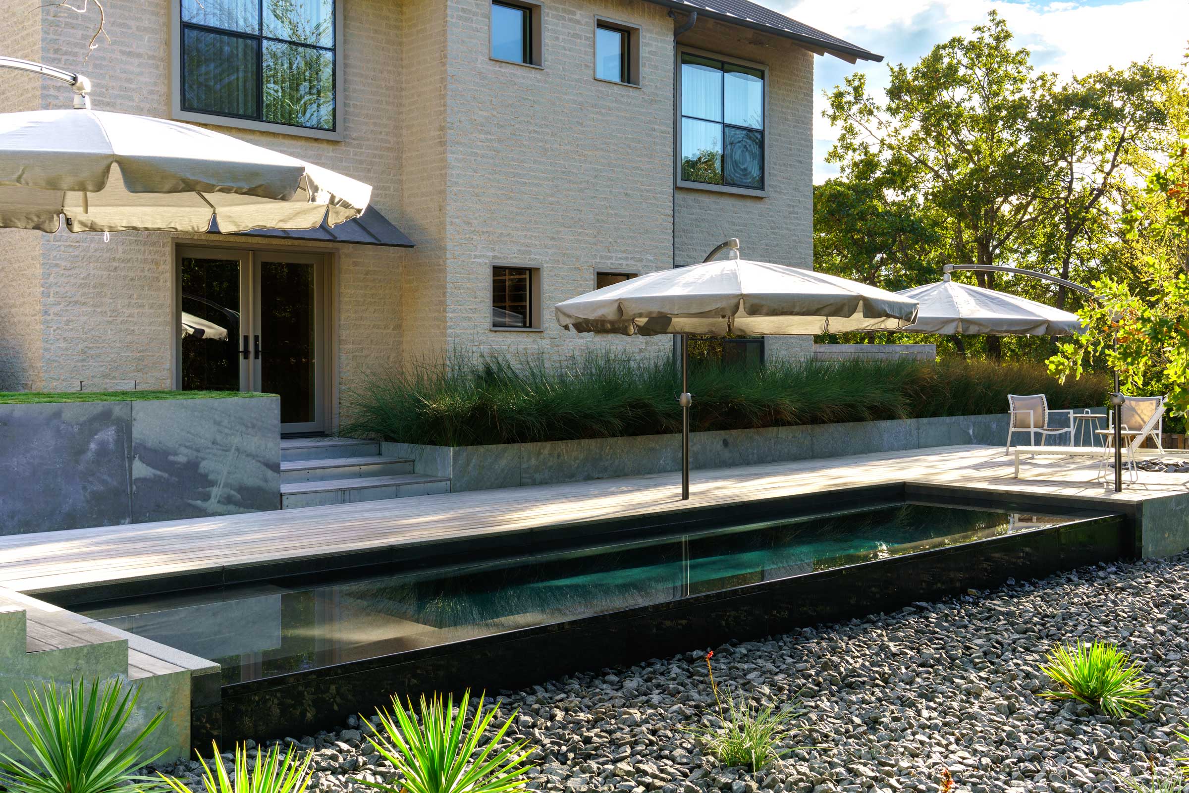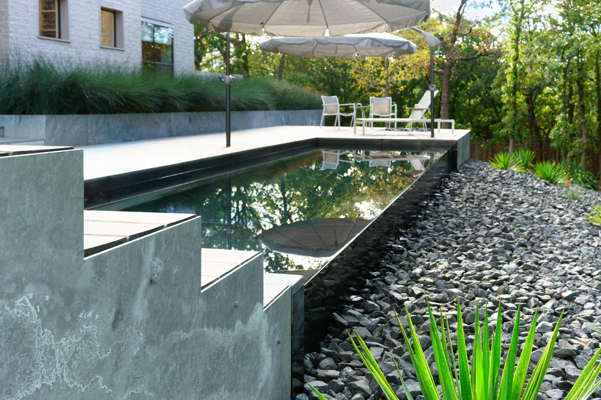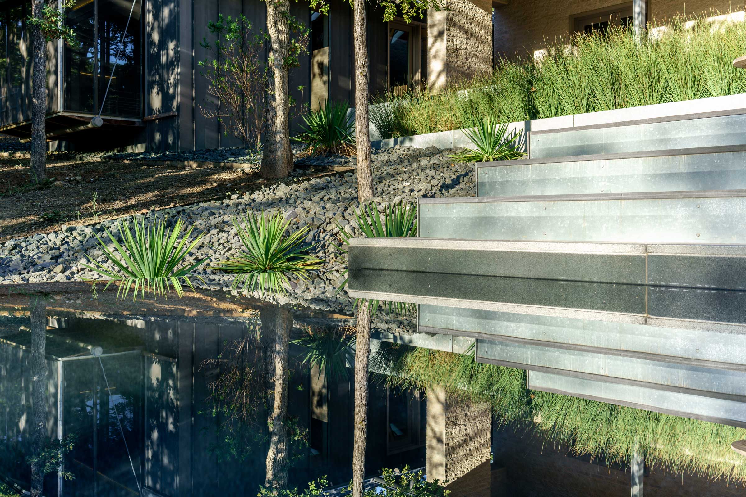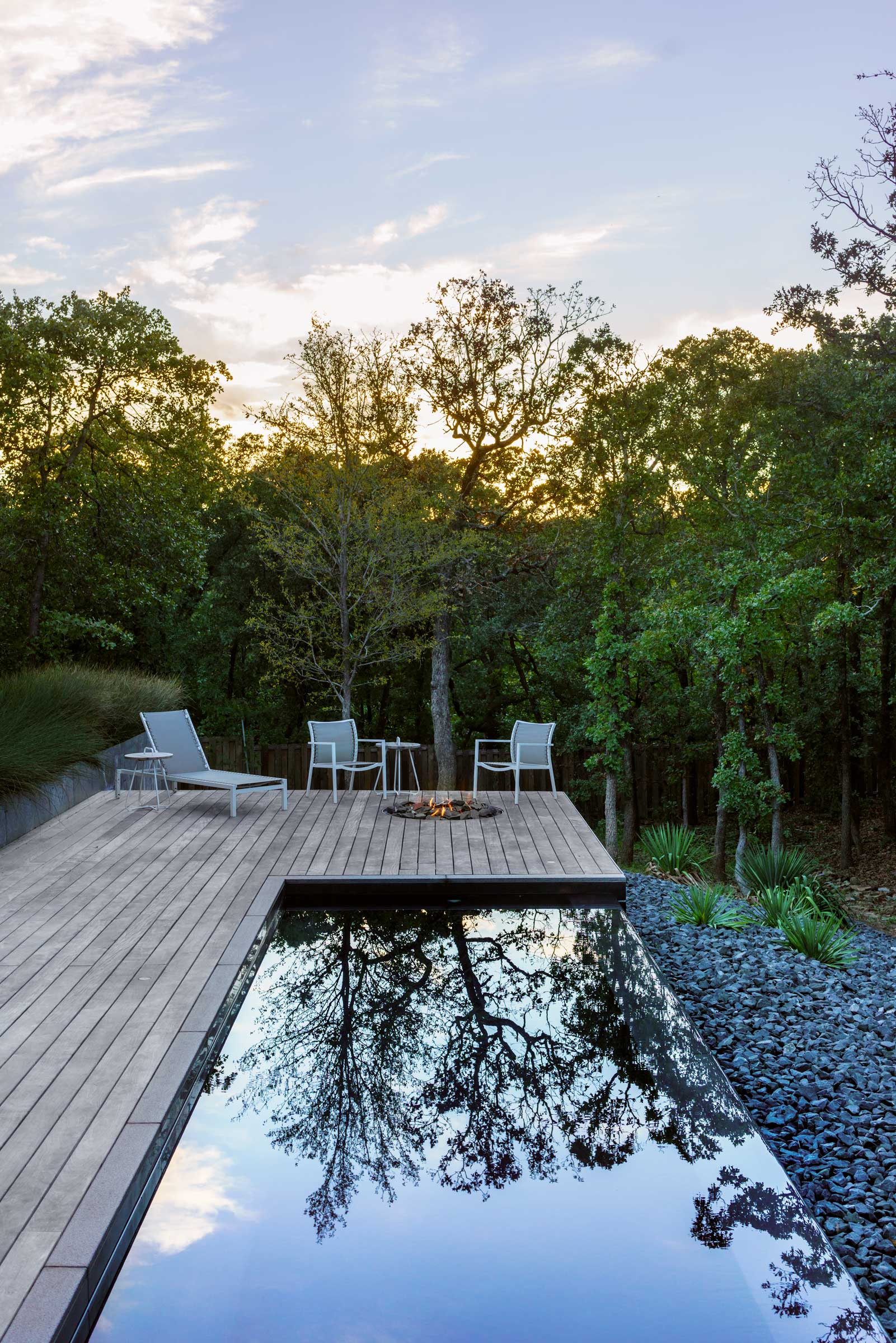 The pool is primarily viewed and approached from an elevated perspective, and its long narrow proportion refers to the nearby forms and voids of the house. Pointing west from the house’s entry pathway, the pool enhances views of the sunset. The negative edge detail provides a seamless connection with the oak grove to the north.