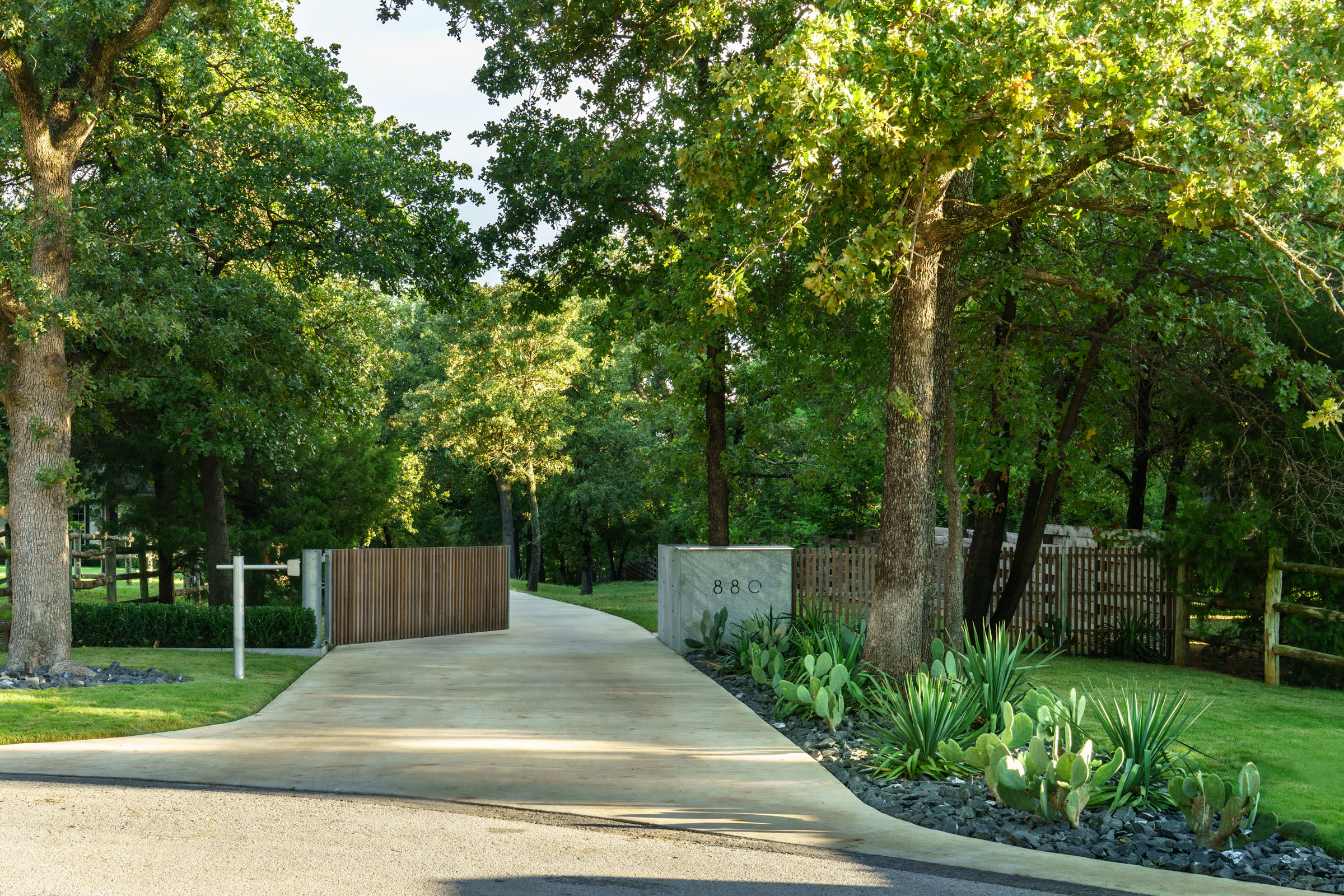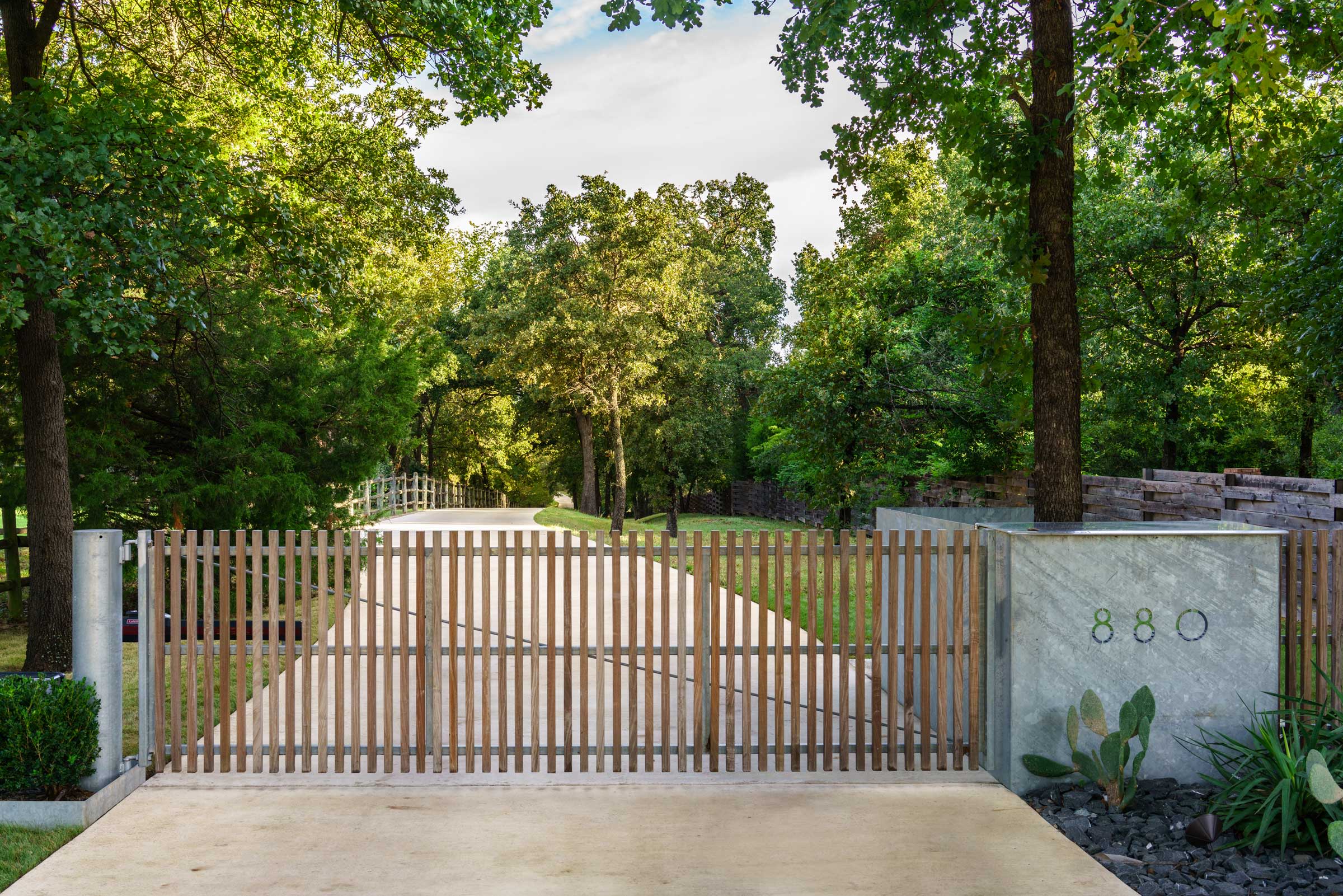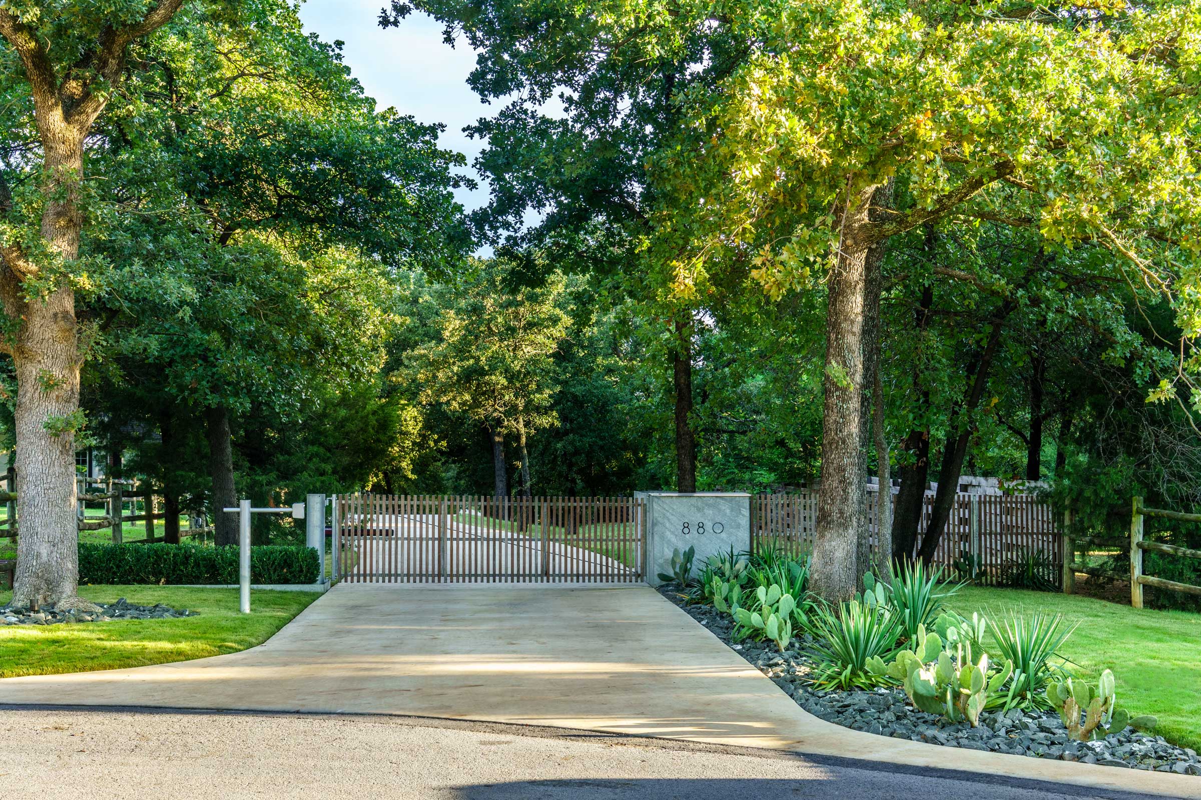 This is a property where JDS, Inc. realized the remodel of an architecturally significant house. Part of the project included altering the residence’s relationship to the site with new hardscape and landscape. This new entry gate and surrounding components foreshadow what’s at the other end of the long private drive.