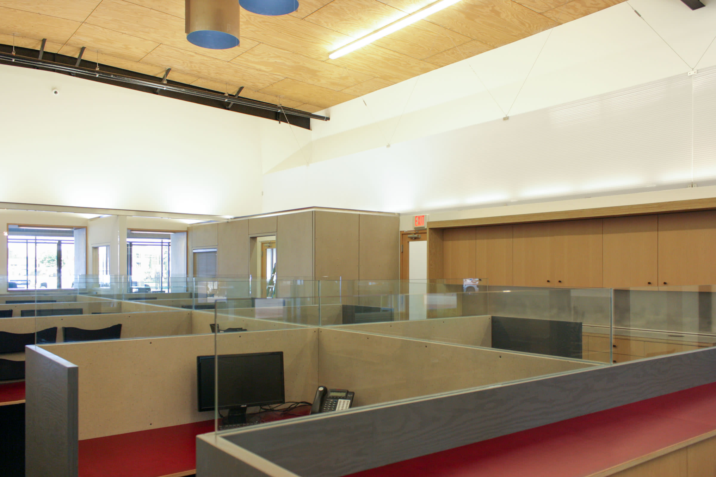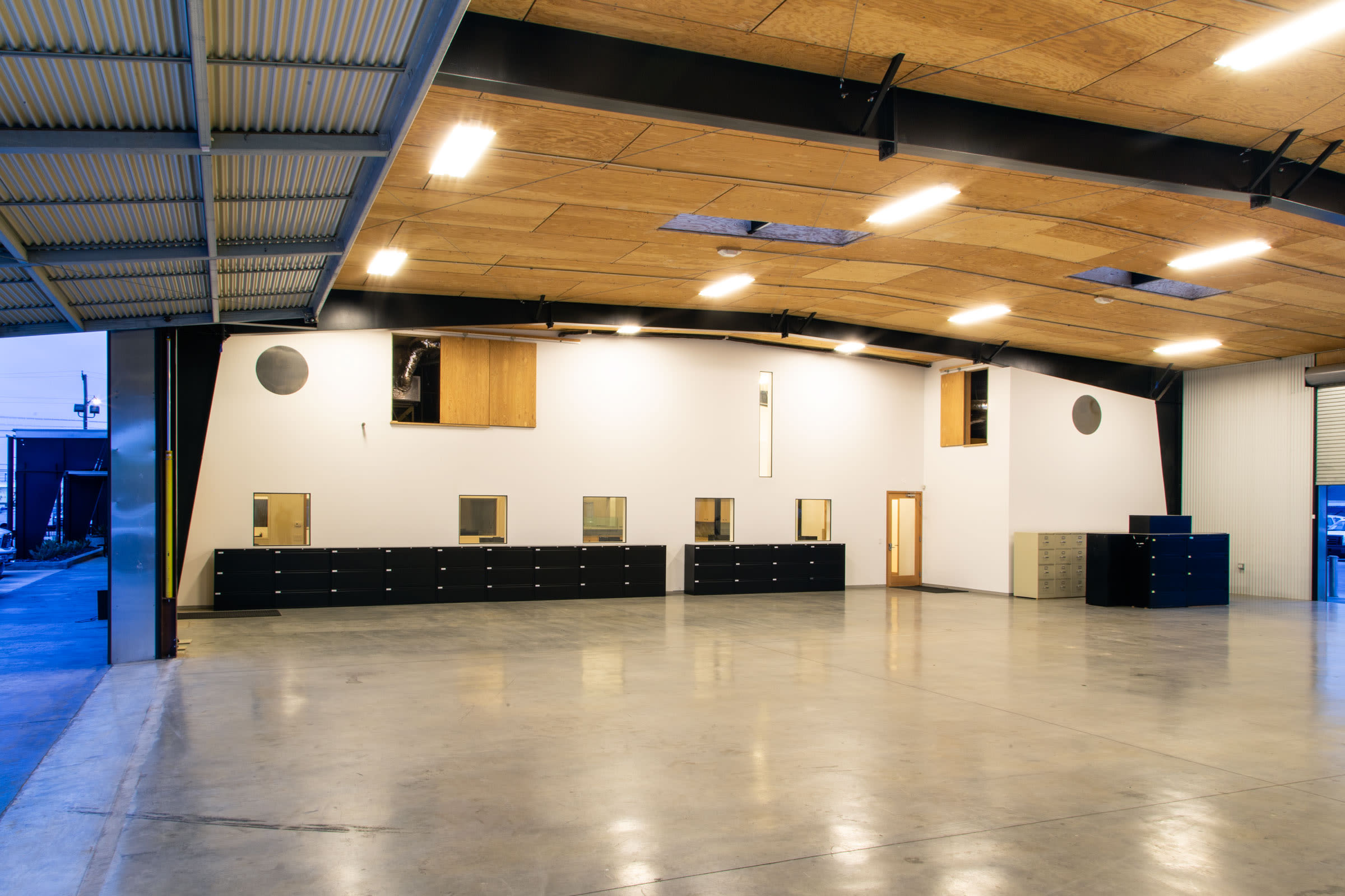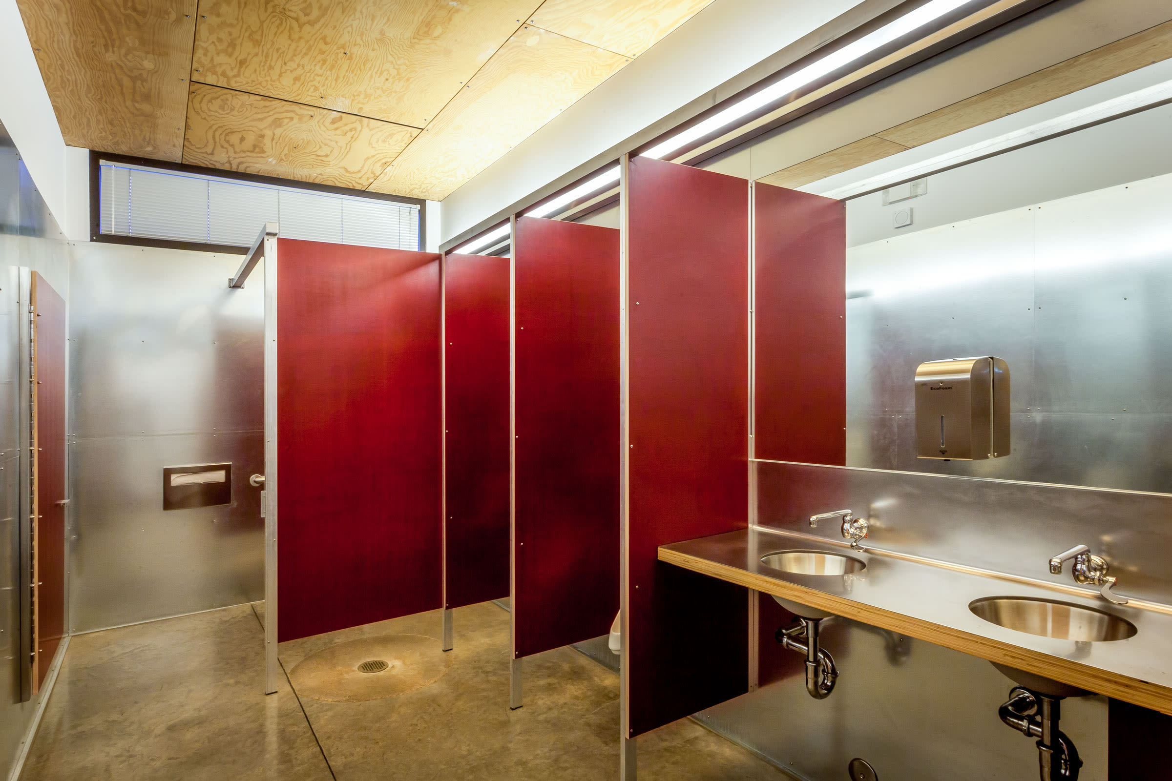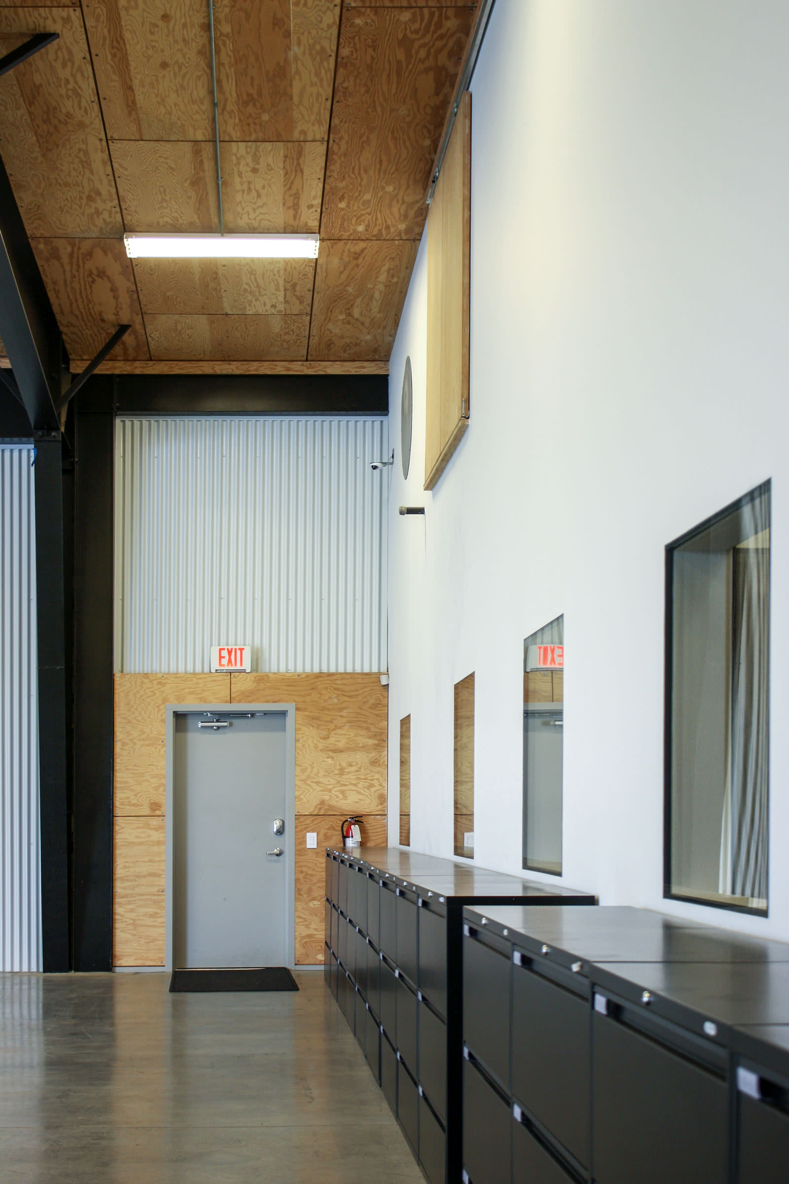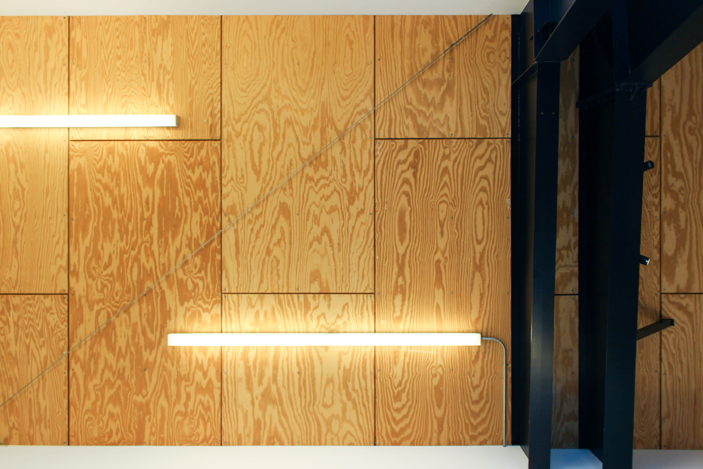 CEILING Regardless of the many activities which occur within this building, all tasks take place under the same condition overhead. The ceiling of the entire building is clad with standard-sized sheets of fir plywood with approximately 9,750 exposed fasteners. The prominent use fir plywood within this structure was inspired by the fact that the material is also commonly used to line the freight space of box trucks. The material is of an exterior grade, meaning it could be used and left raw both inside and out.