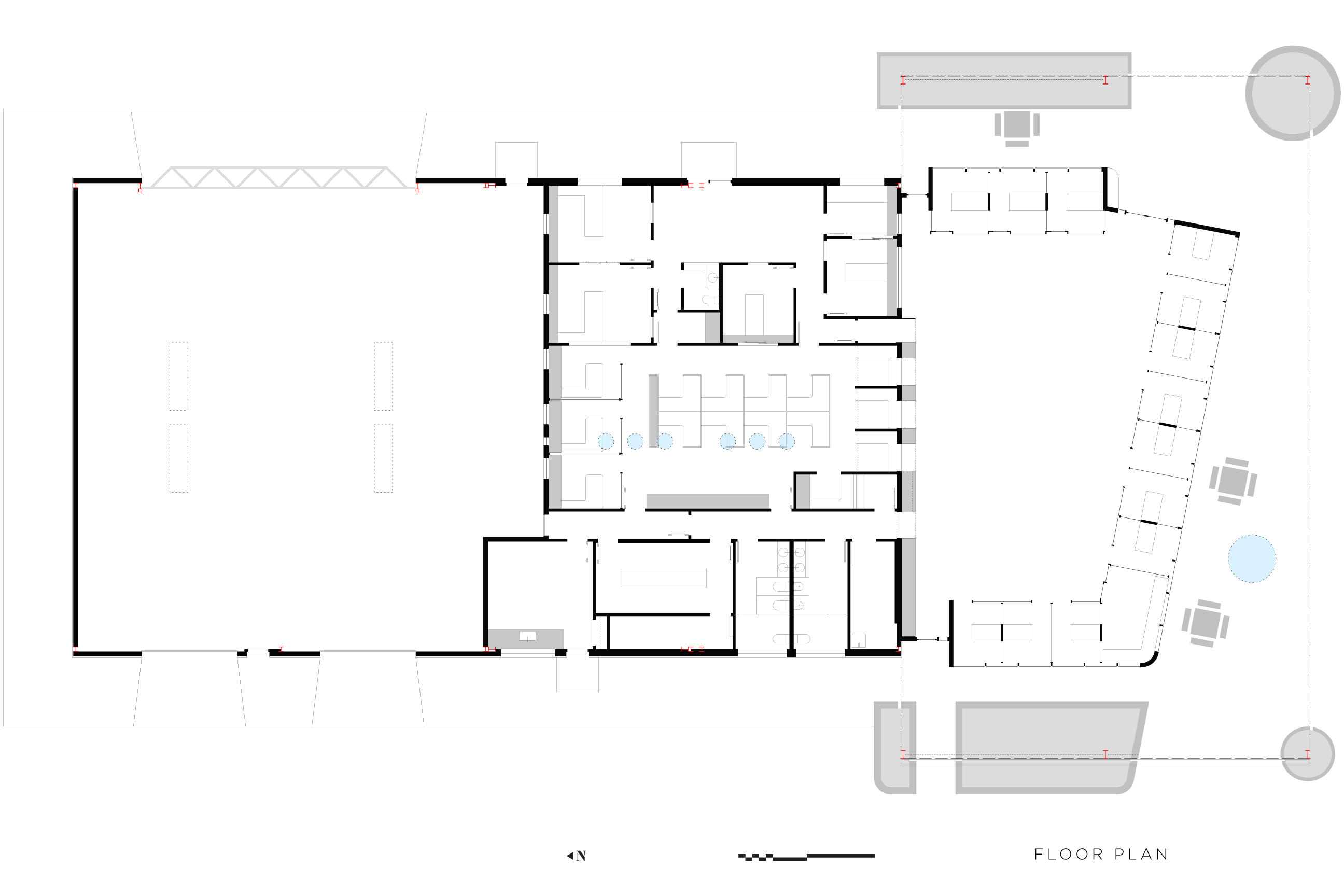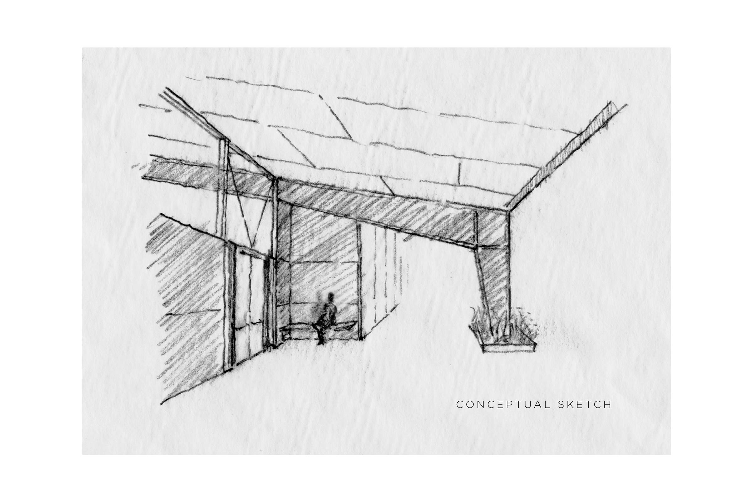 SHEETS & STRINGS The building type for this project was chosen based on the existing structure on the site being a rigid frame metal building. Five (5) steel main frames and forty-eight (48) steel roof purlins from the existing structure were used in the new design. New components of that same building type were used to extend the building ninety (90) feet to the north. Because all the primary structural components of the design could be traced back to their essence of ‘sheets & strings’, this idea was a queue for all detailing decisions throughout the design.