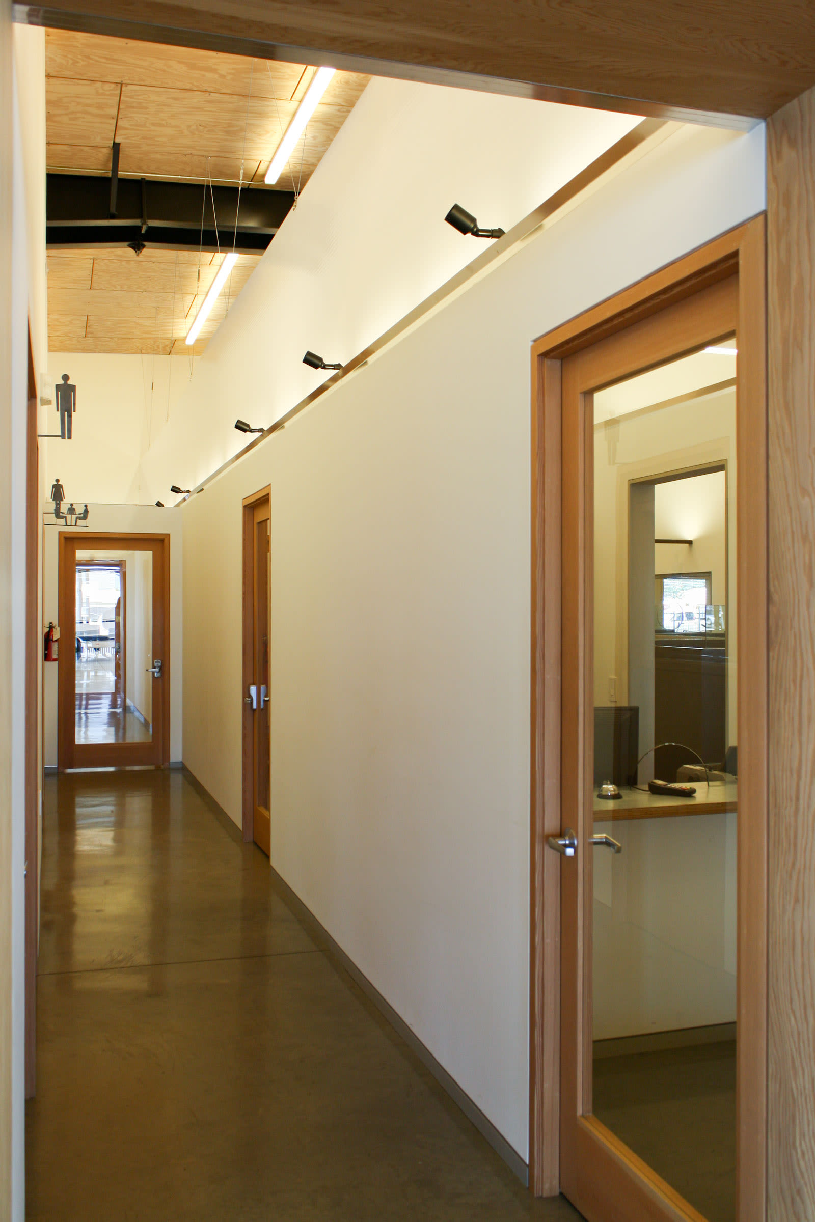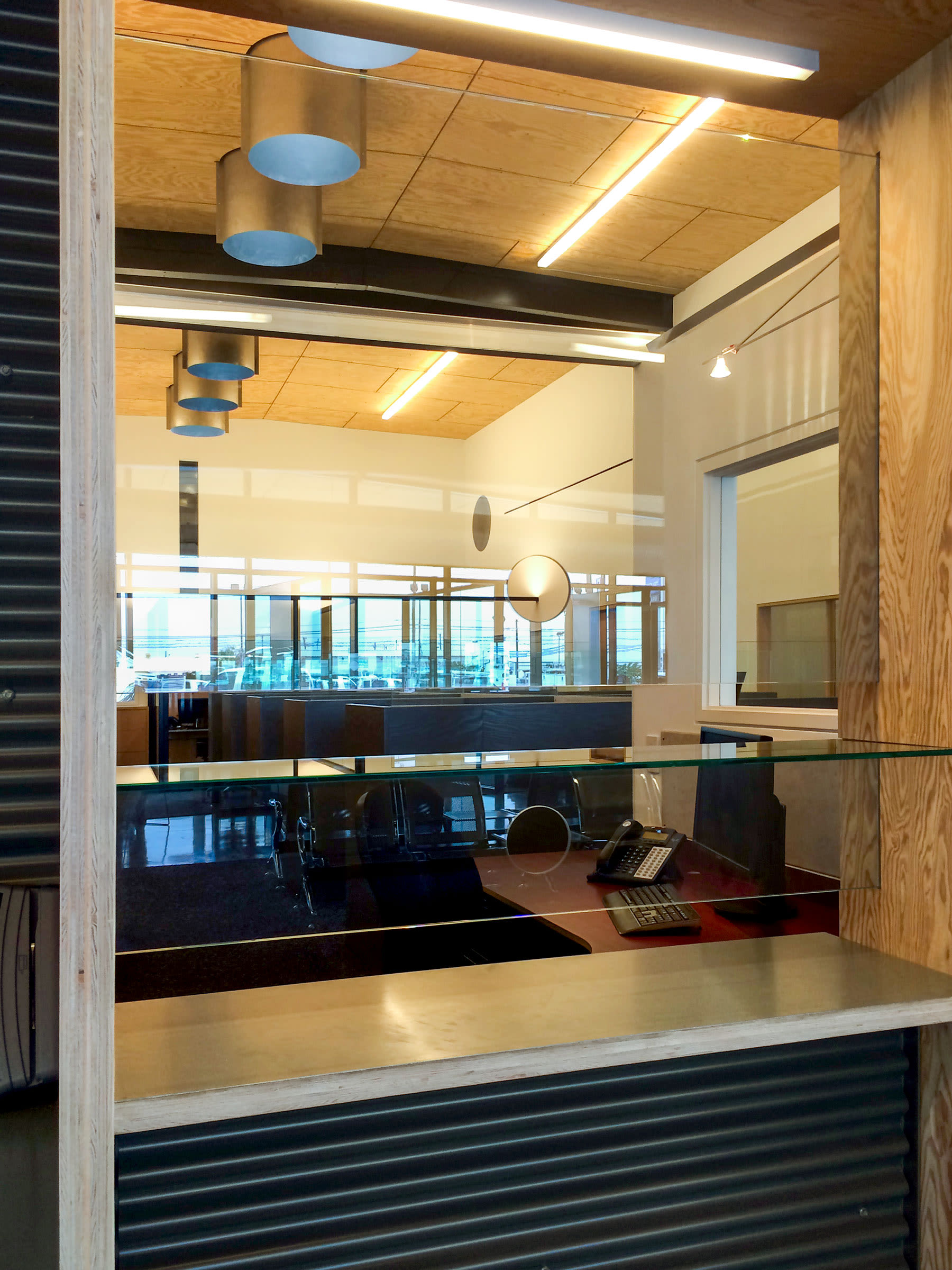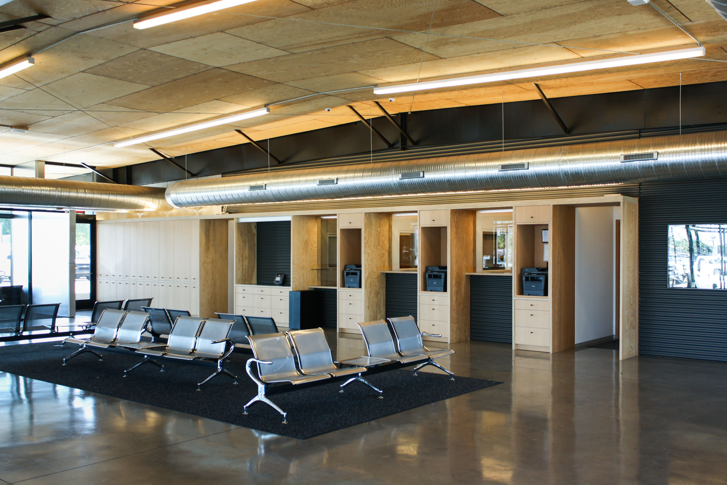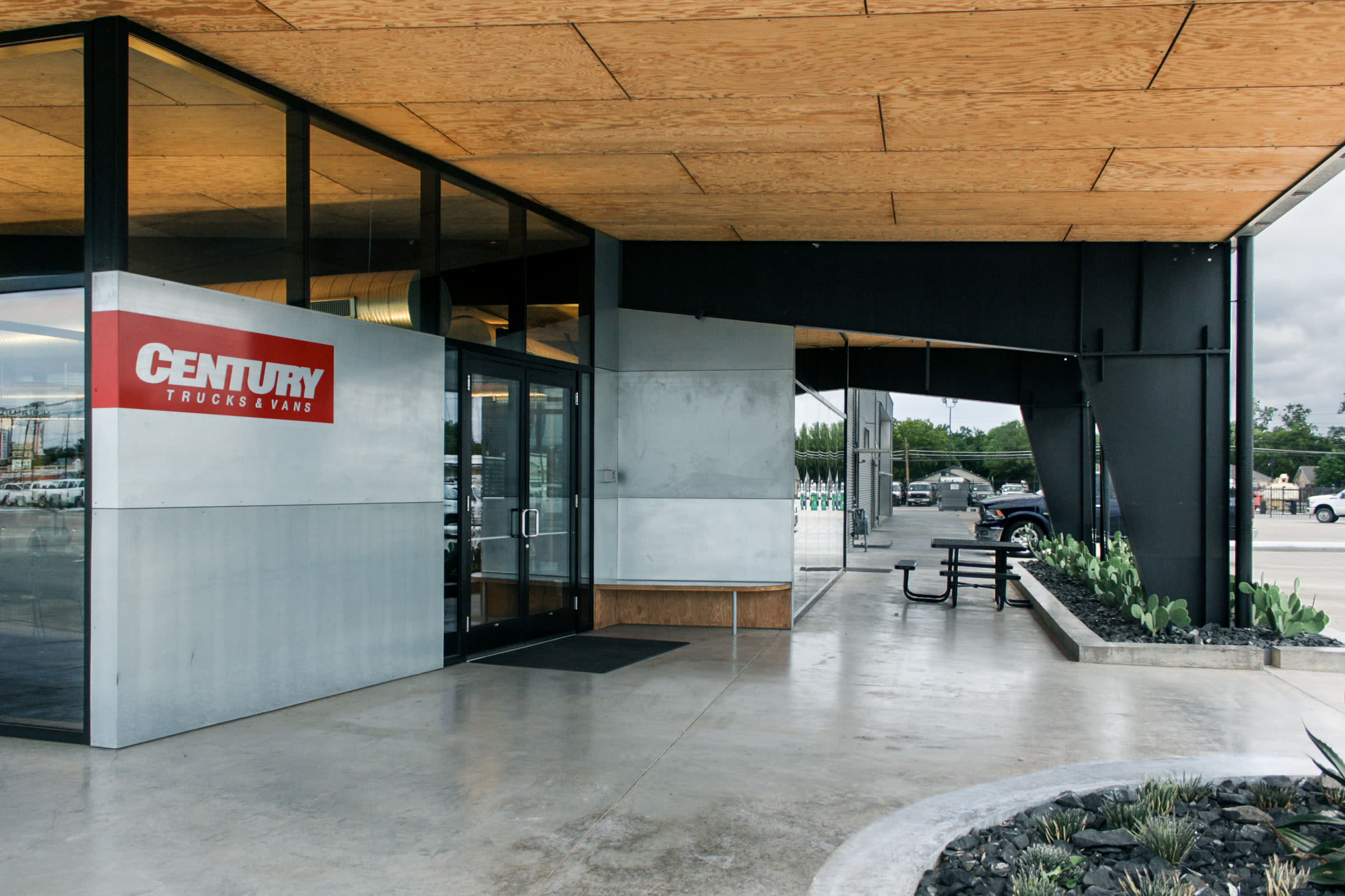 MAIN FRAMES The day I was introduced to the site, the client and I walked onto the property and approached the existing vacant building. I immediately noticed some missing tiles in the drop ceiling of the porch and a ladder not far from where we’d stopped to chat. After asking the client if he minded me taking a look at the structure, I found myself up the ladder and in the middle of what had become a thriving pigeon community. I was taken aback and delighted at what I saw. So amazed, in fact, that whenever I climbed back down the ladder to give my report to the client, he said my face looked like a little boy who just got a peek at something he wasn’t supposed to see. What I’d found clothed within those old ceiling tiles, was a massive steel main frame reaching over the entire length of the structure. This discovery was so exhilarating because it meant the building was similar in frame to the trucks that would ultimately be sold out of this place. As a subtle indication of the building’s function, those long spanning, low-slung steel main frames were itching to be set free and revealed to passersby on Main Street.