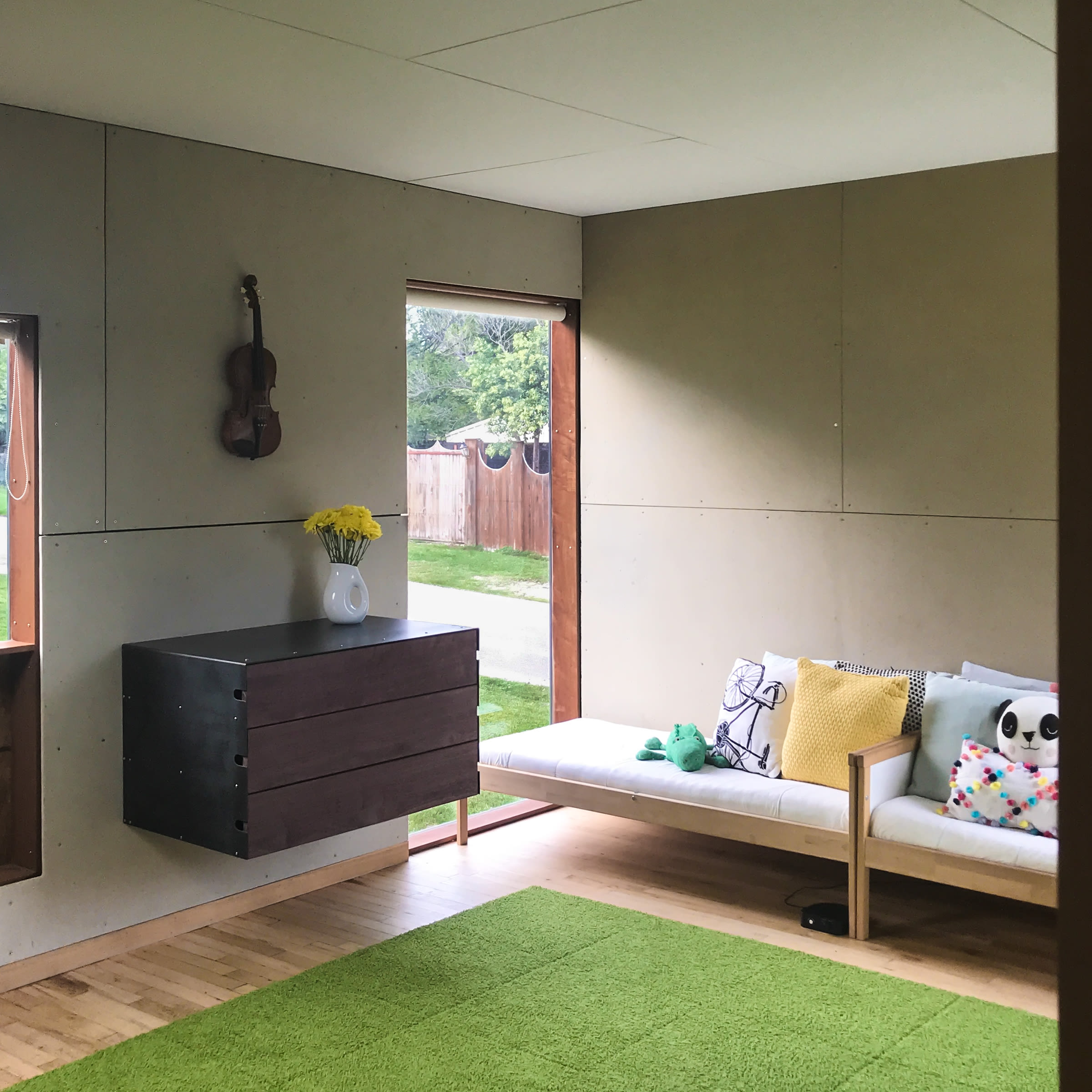 . it’s suspended above the floor to reduce its visual load and afford toe space.