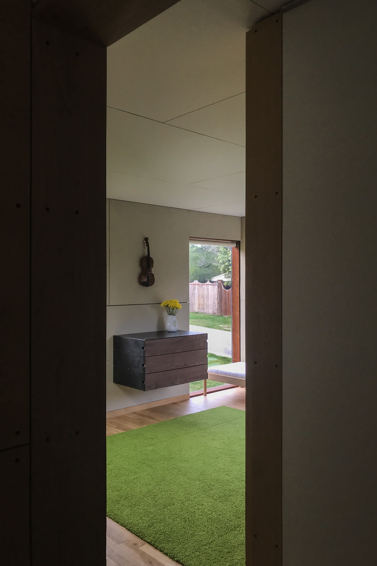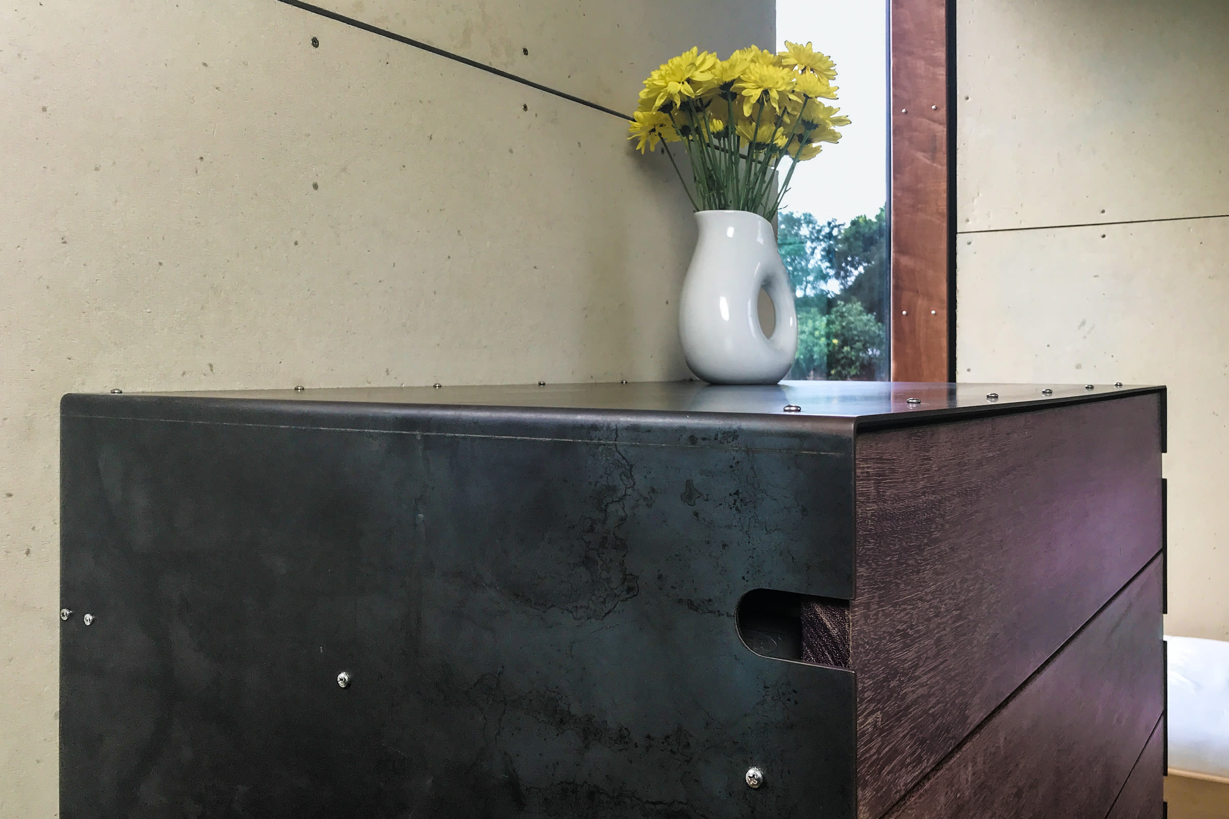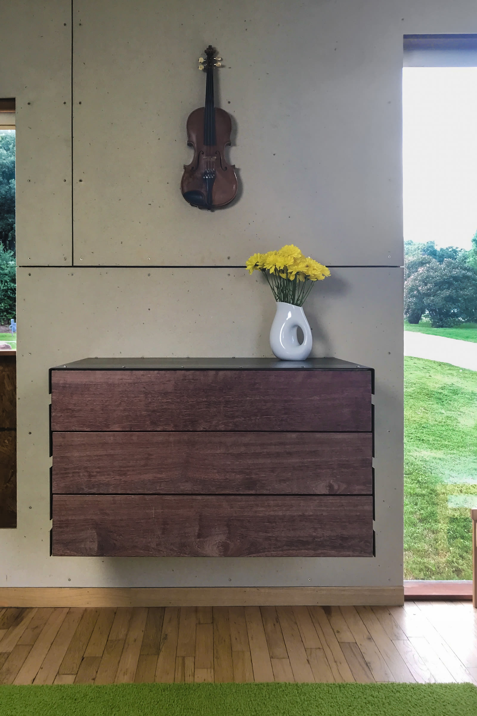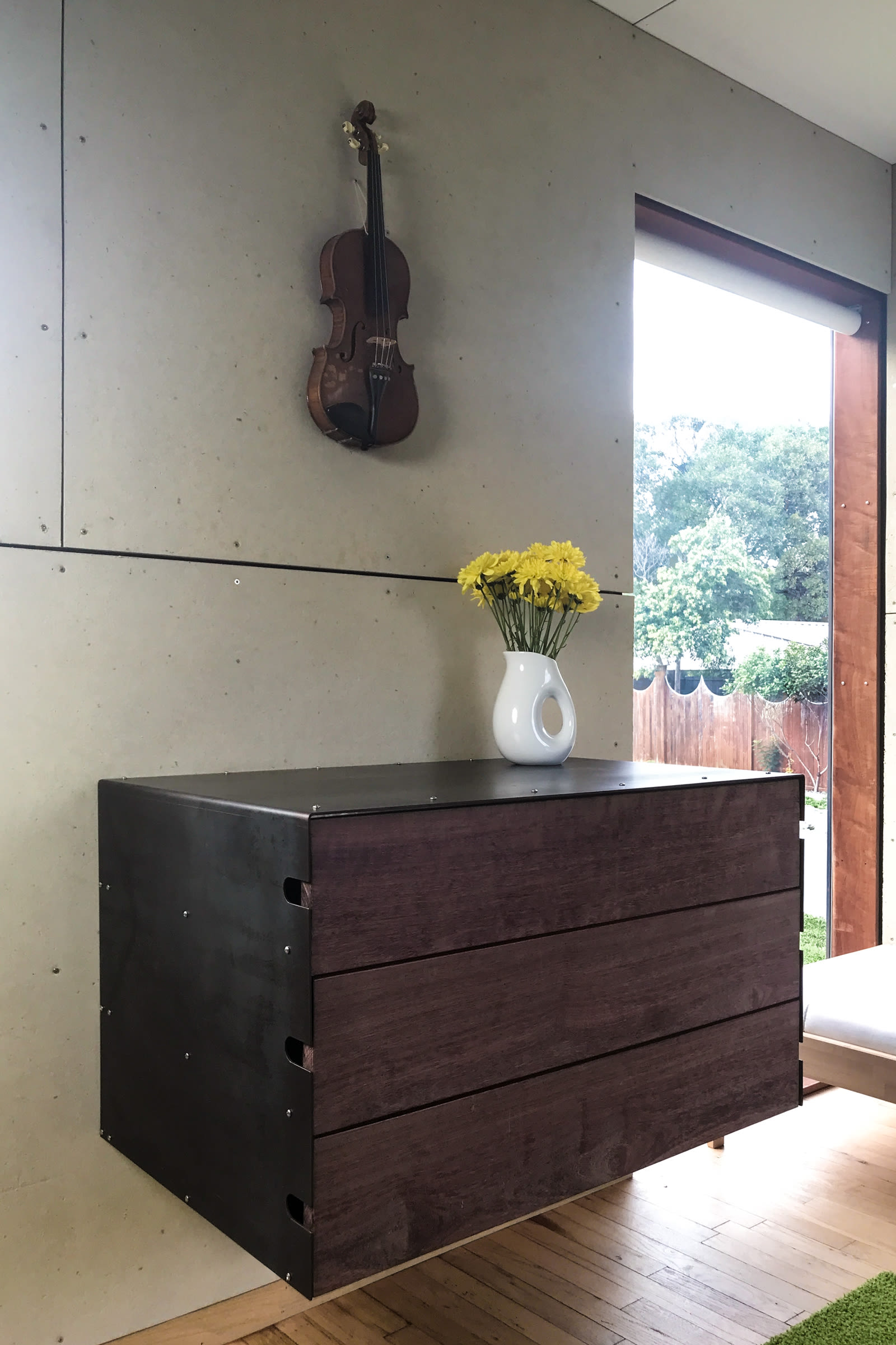 Three drawers are suspended off the wall by being swaddled in a structural sheet of steel.