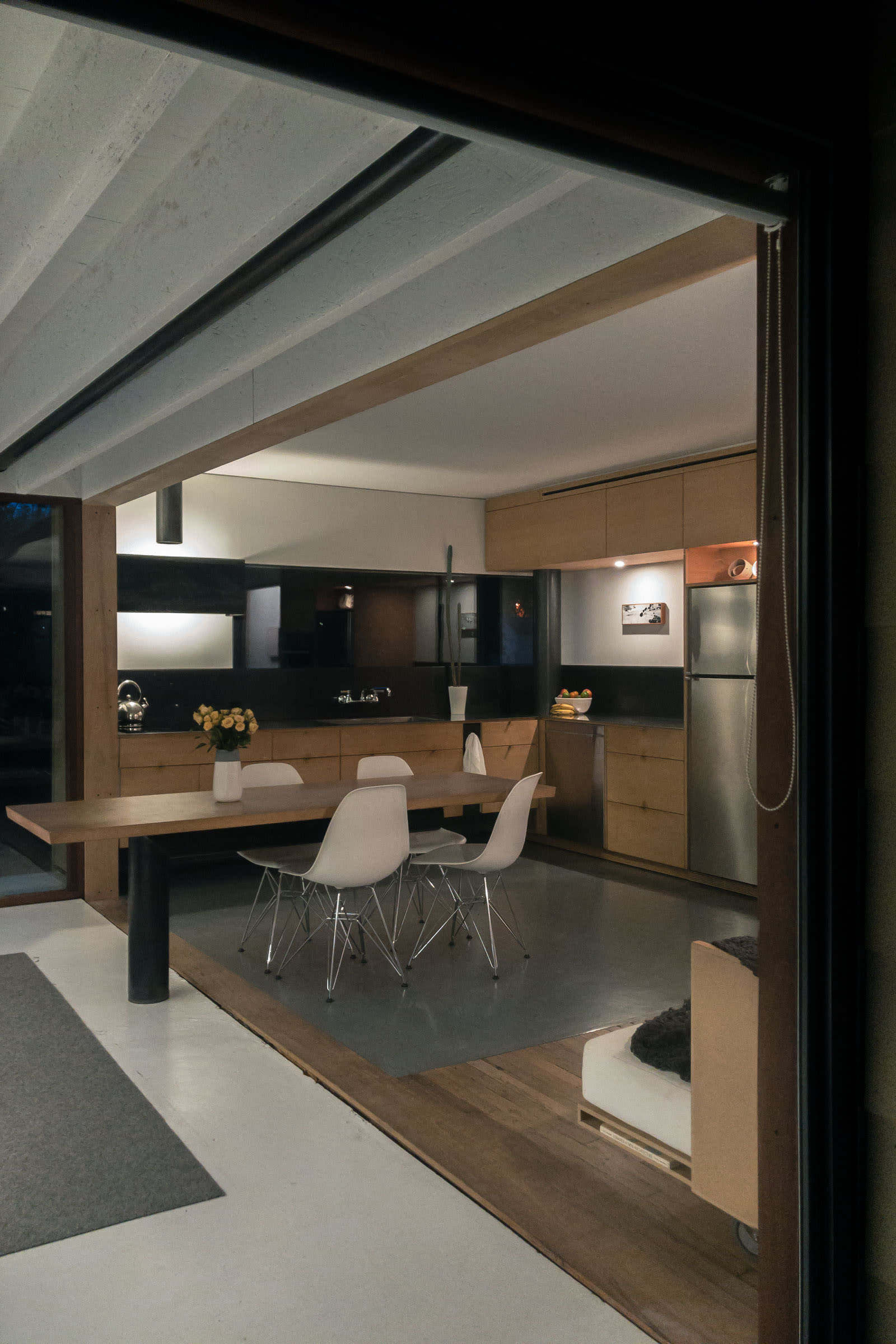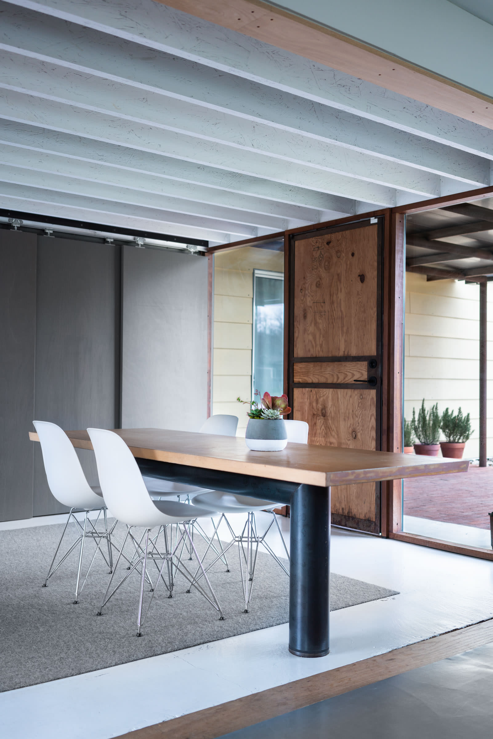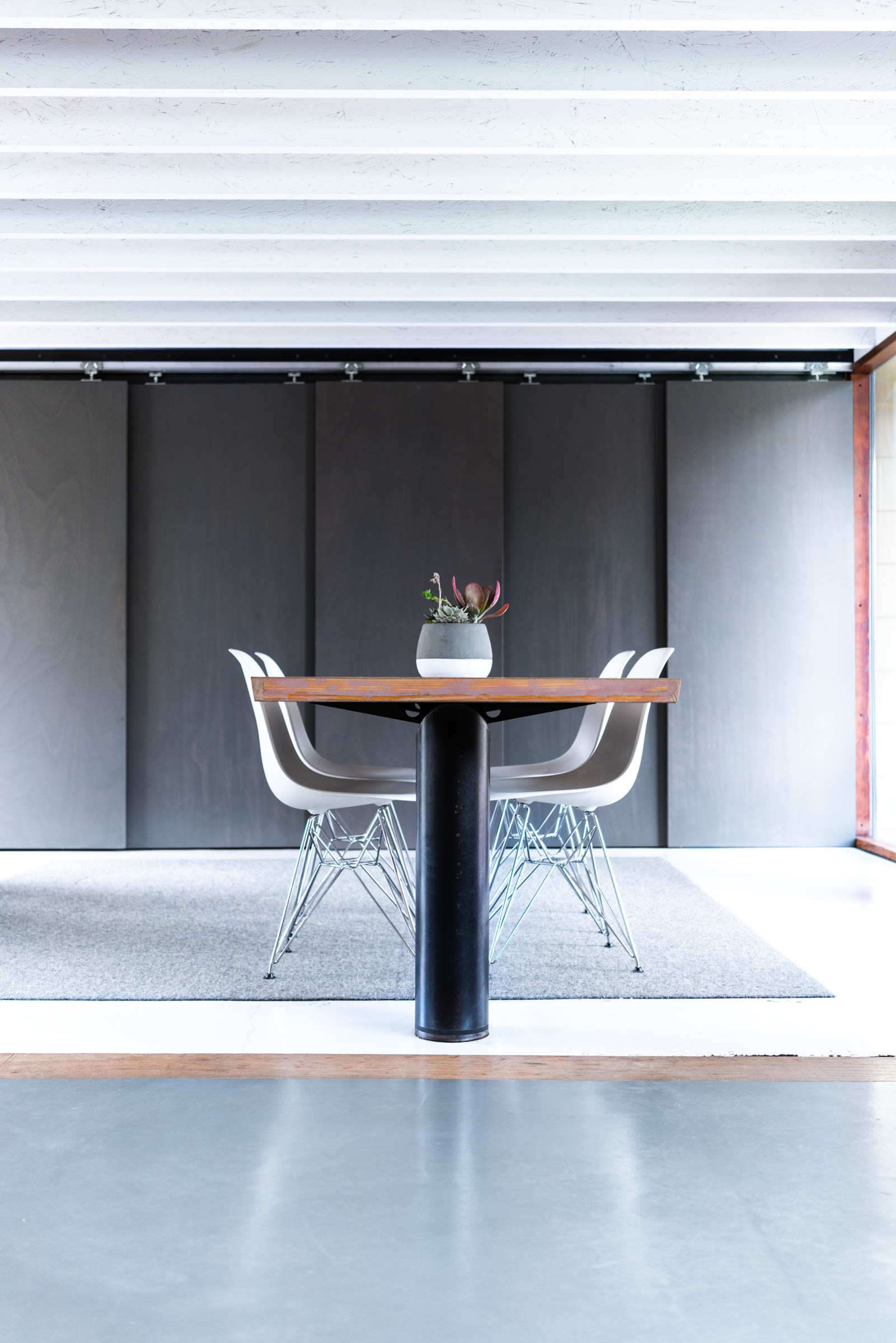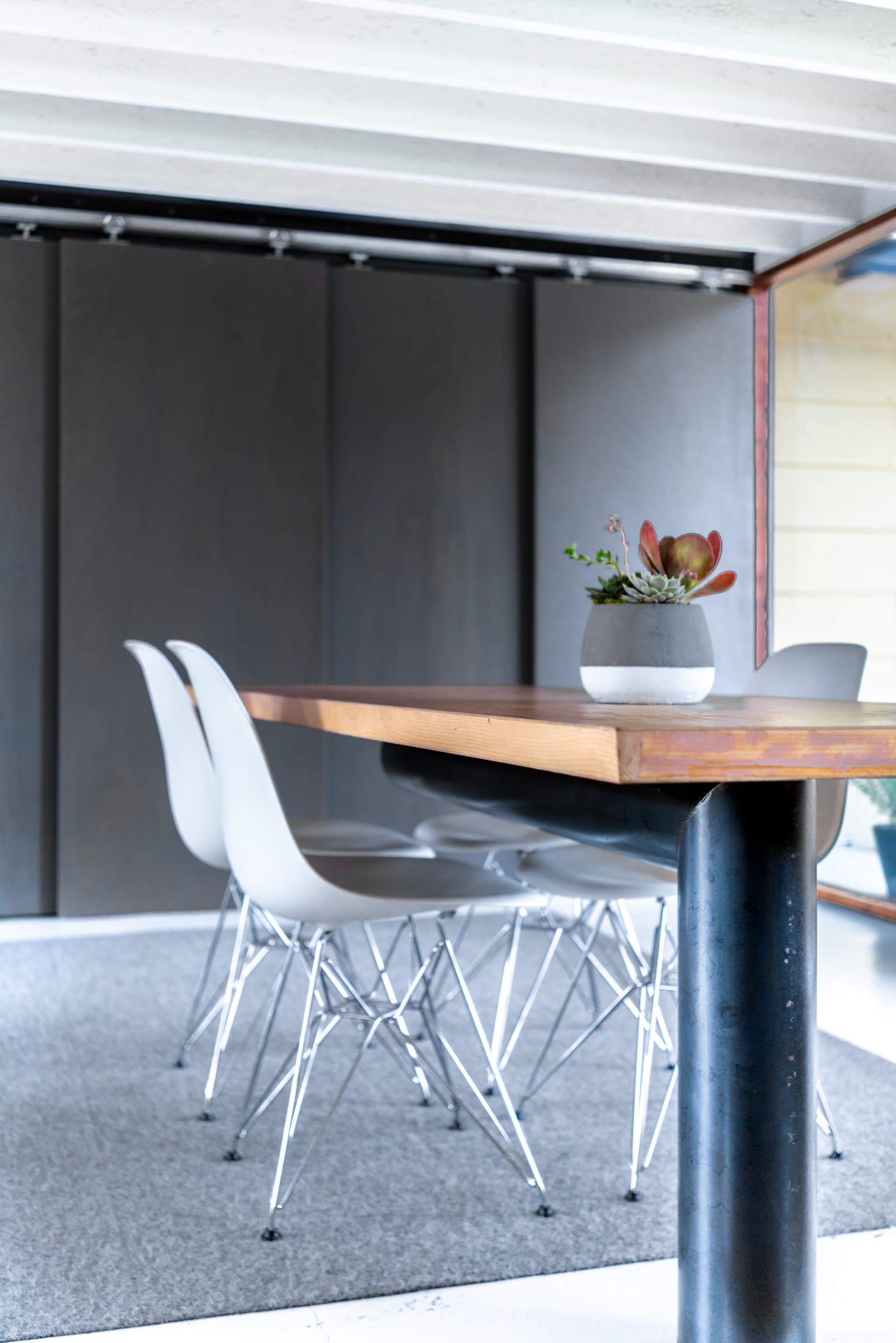 This single-legged, cantilevered table decreases visual presence and increases function within an anomalous kitchen / dining condition. The kitchen table is allowed to pivot into an adjacent space so a party can dine among floor to ceiling glass.