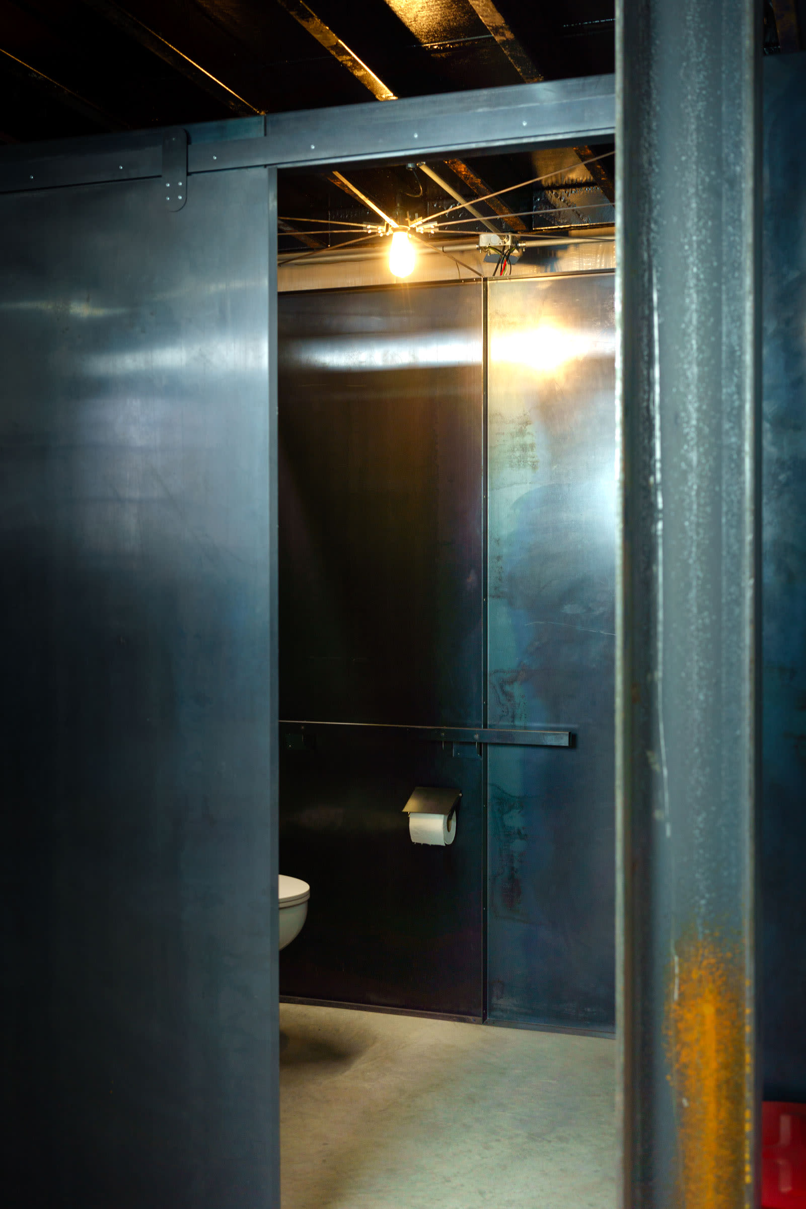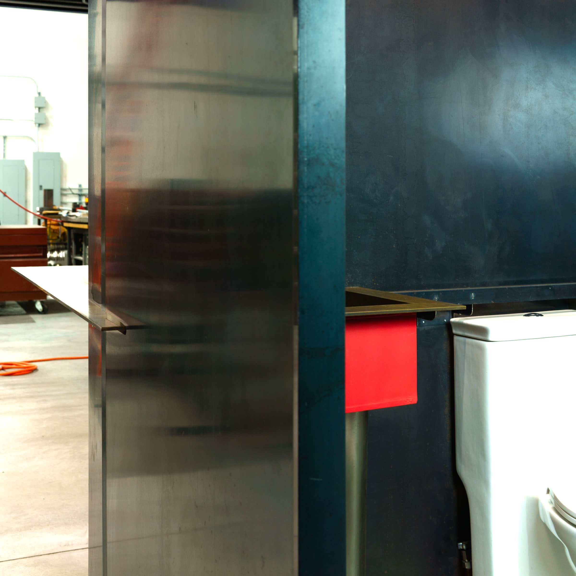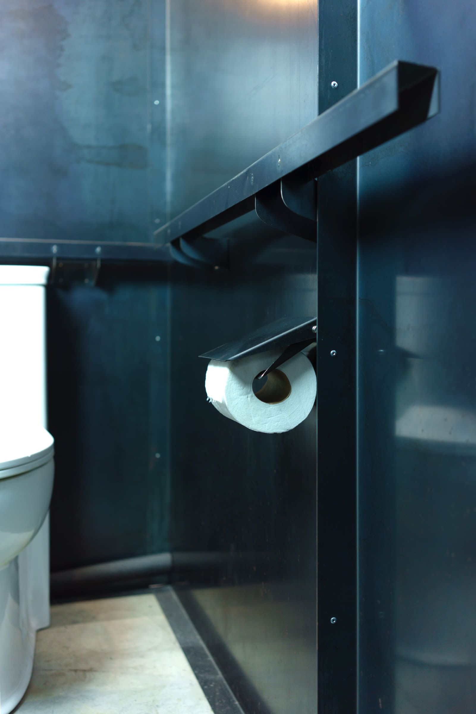 The restroom was designed for one occupant with utmost utility in mind. The client assembled the custom pre-fab steel parts by installing common rivets through precisely-located, pre-cut holes.