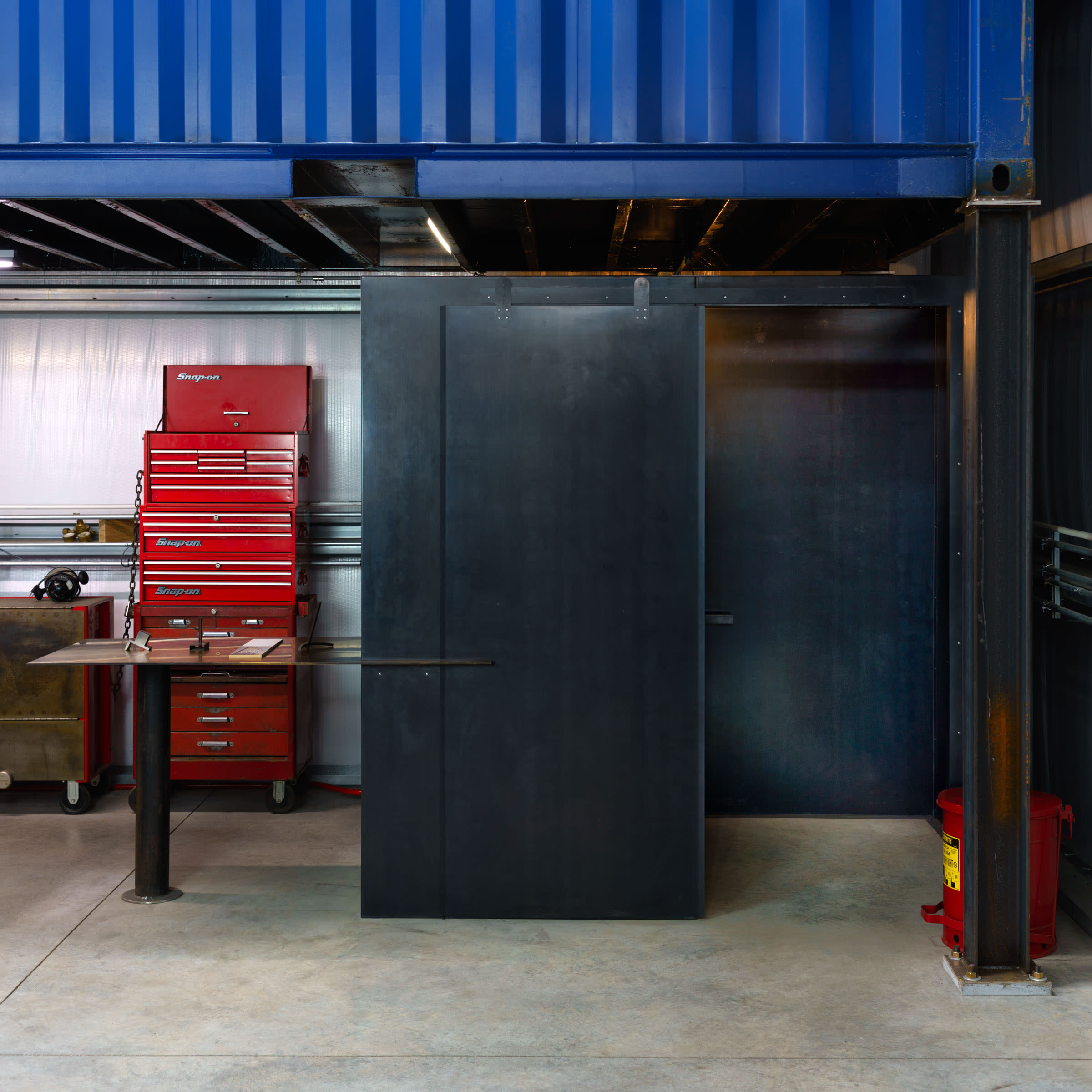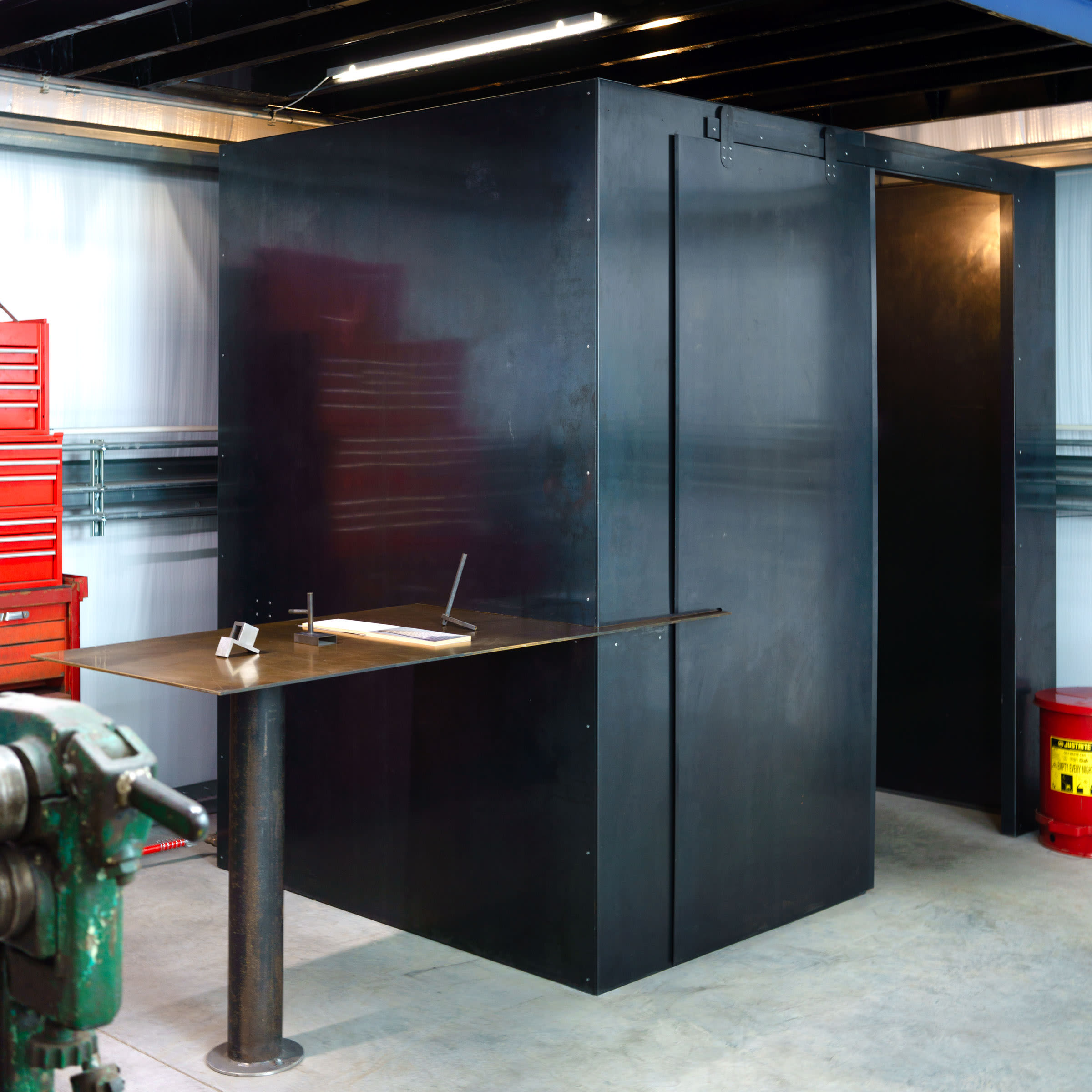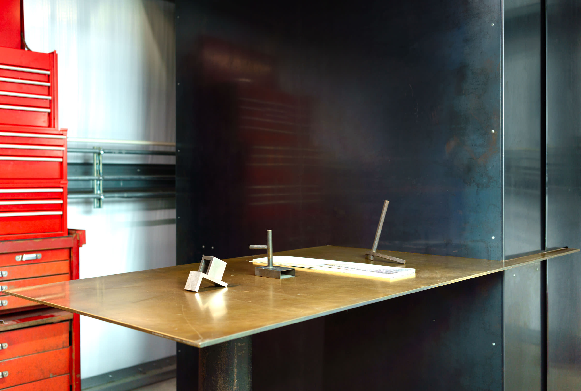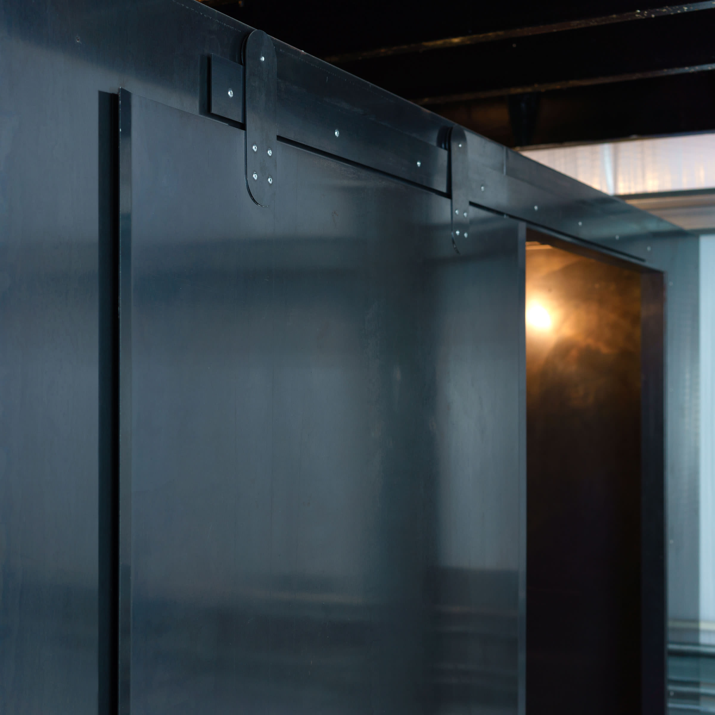 Slicing through a corner of the steel box is an implement of both function and sentiment. The client had originally hand-crafted the assembly from 1/4” bronze plate to be used as a lavish residential lavatory. Repurposed for this application, it now serves as a studio sink inside the restroom and a presentation table out in the main space.