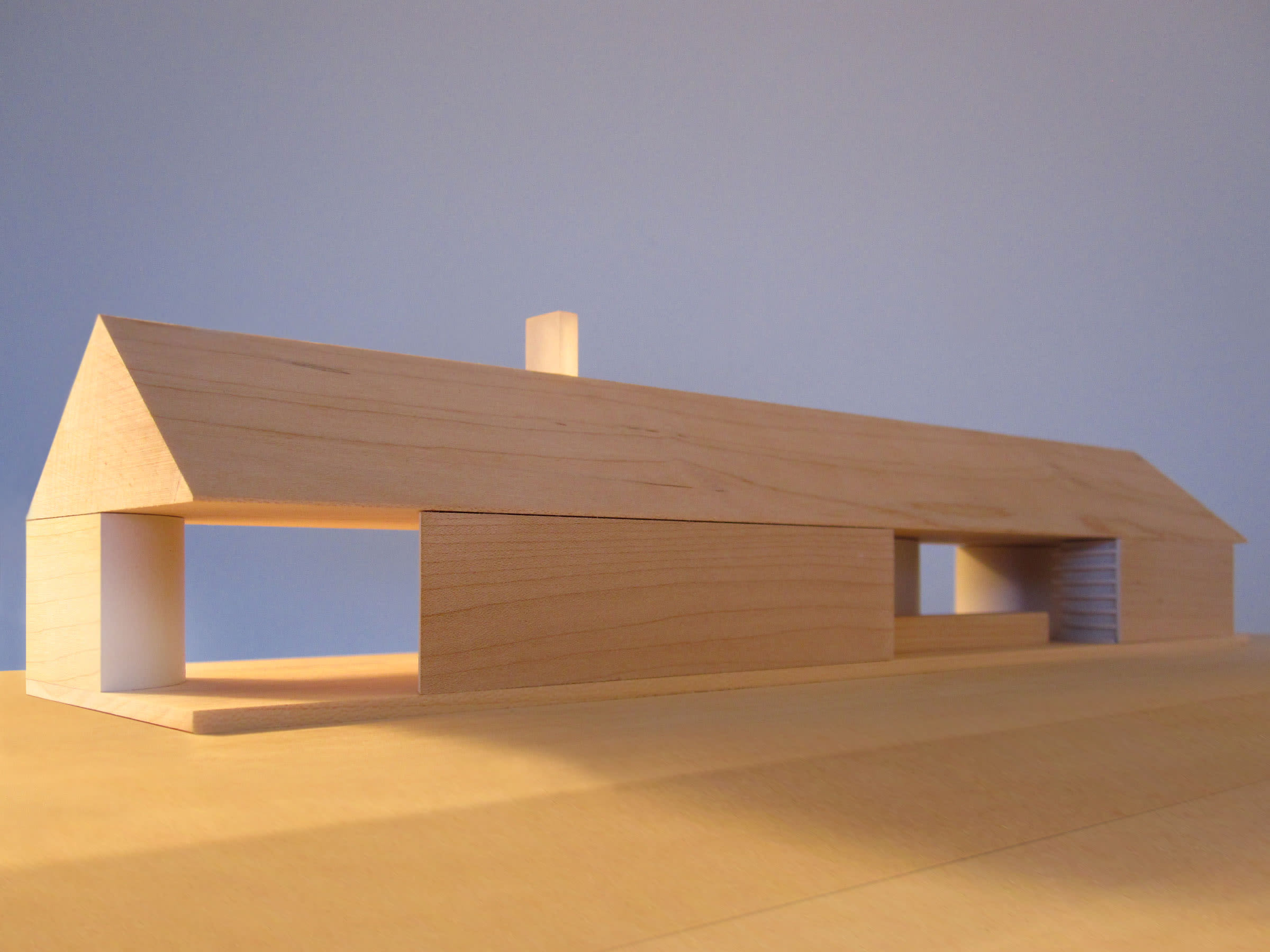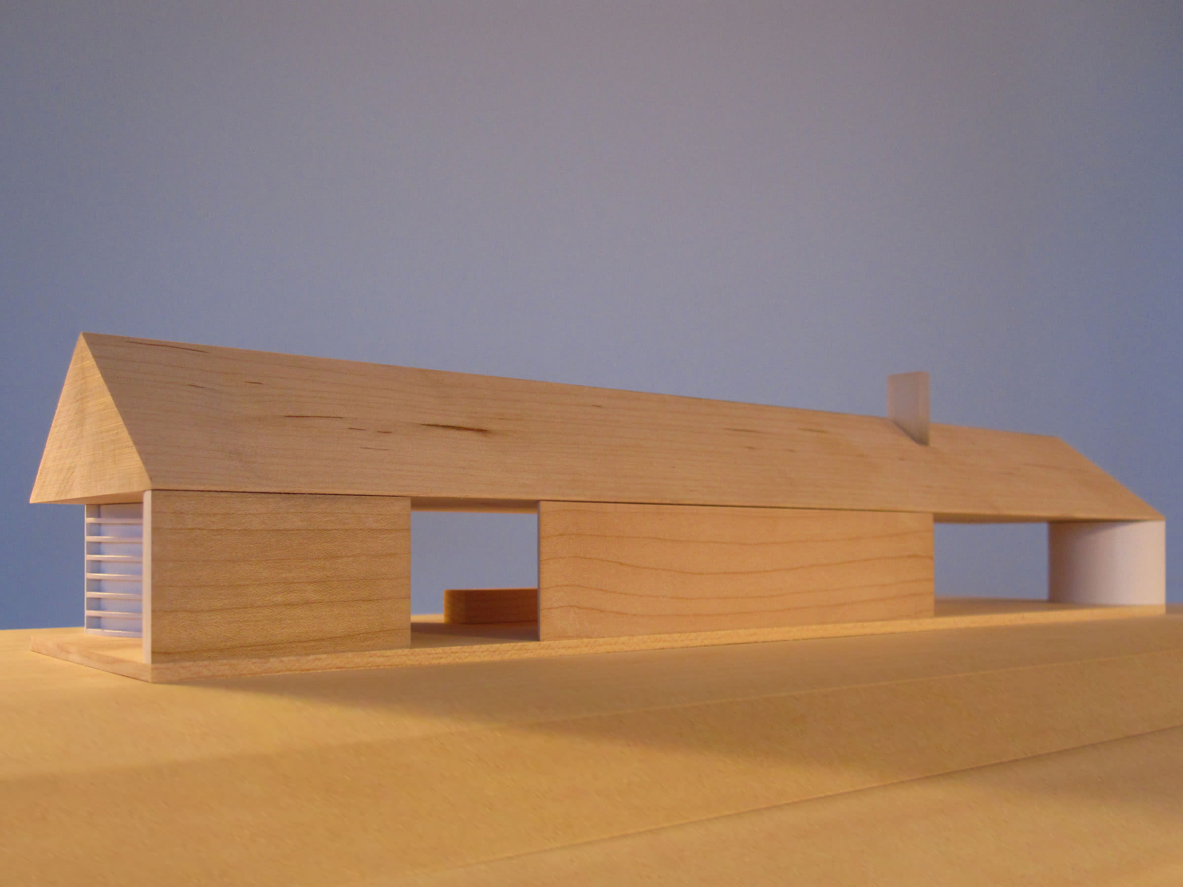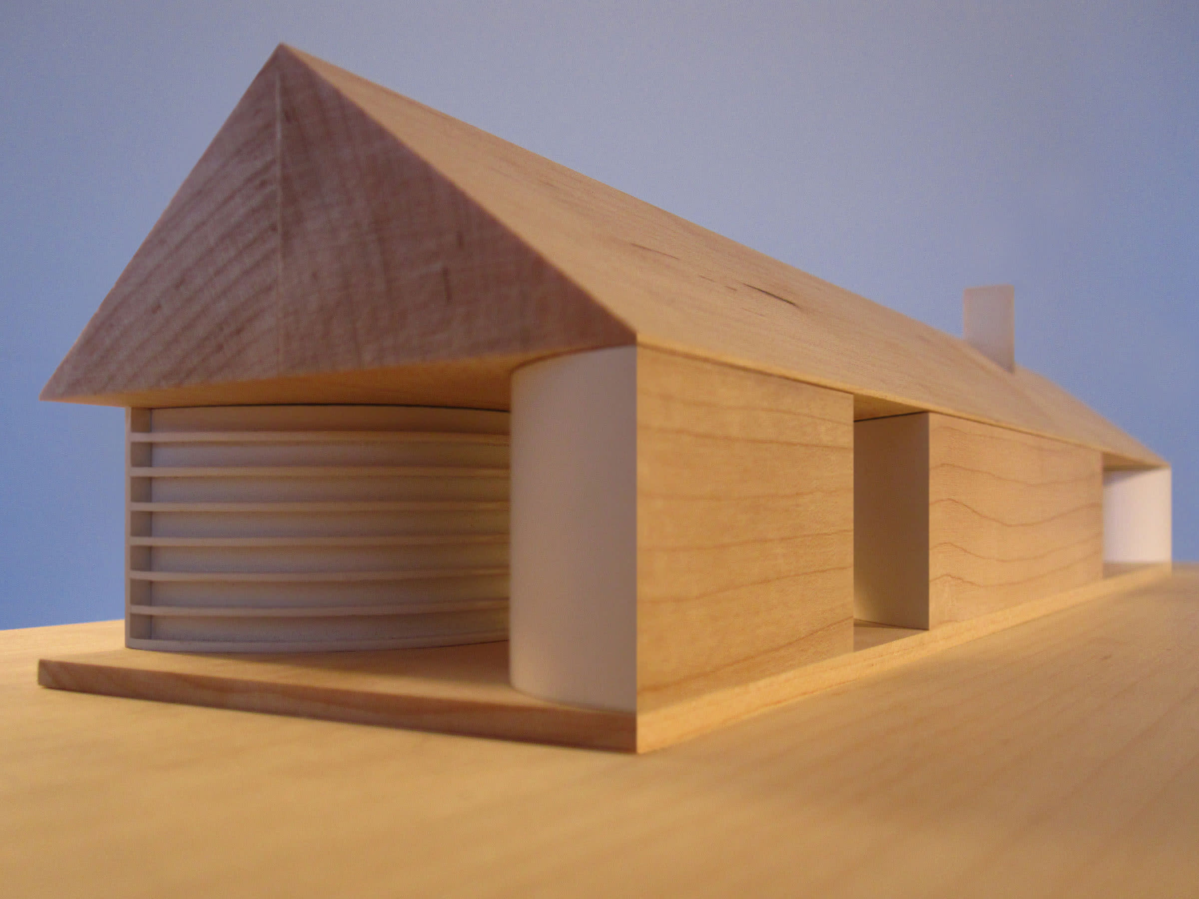 This model was made for an unbuilt project in Massachusetts. The house’s overall form referred to the old tobacco sheds of that region, and its curvilinear interior rendered a strong relationship to the surrounding field and distant trees.