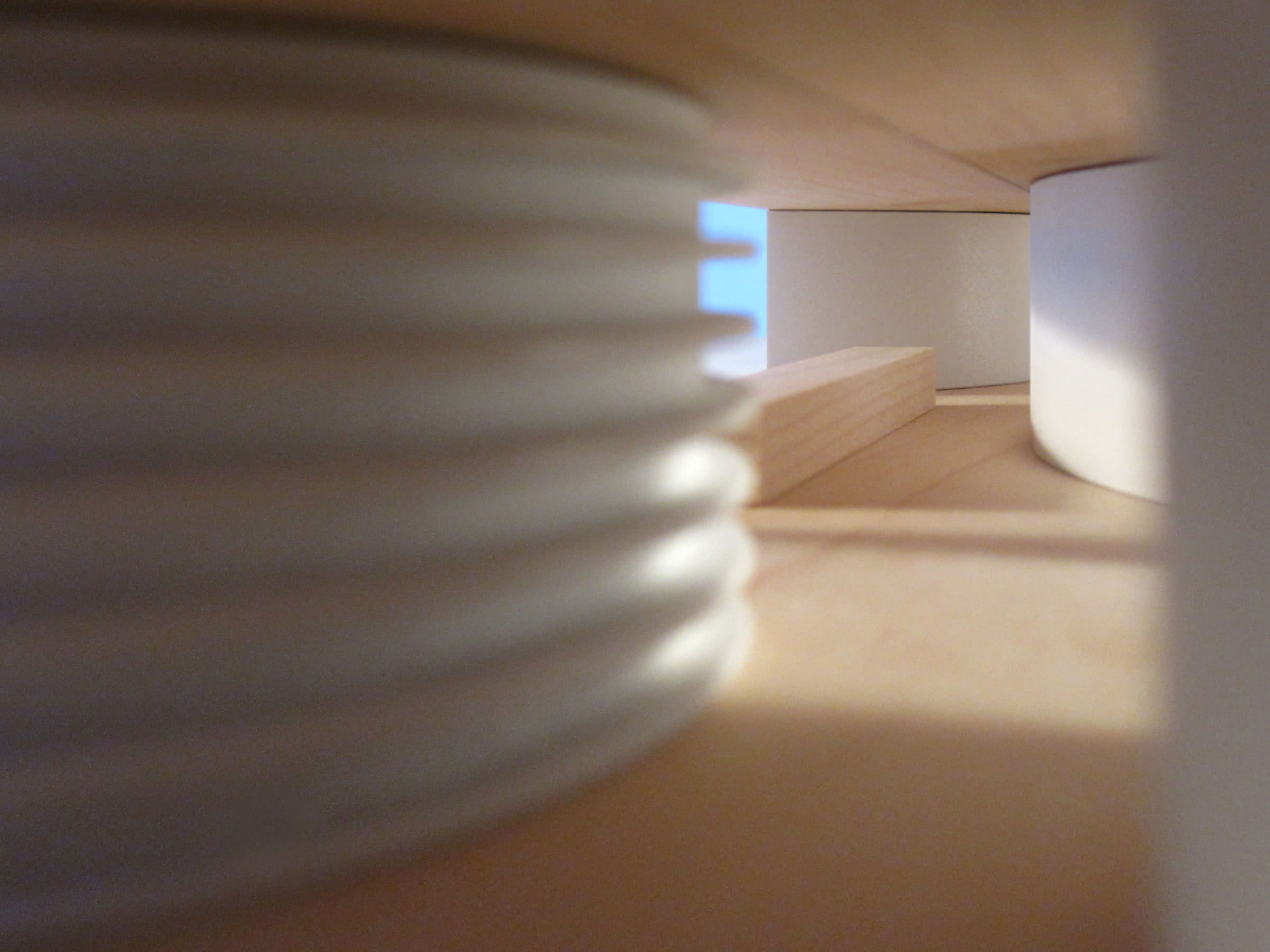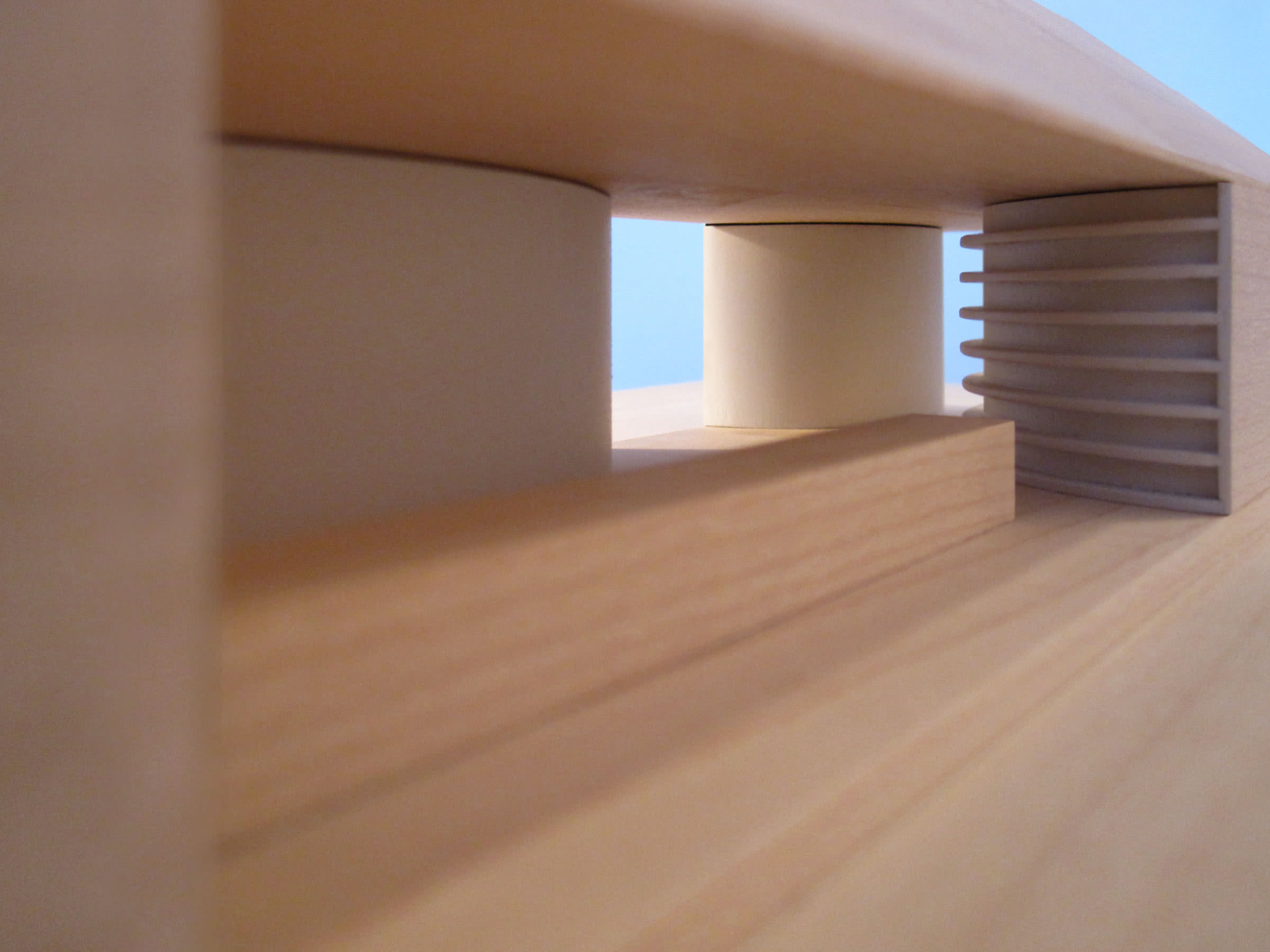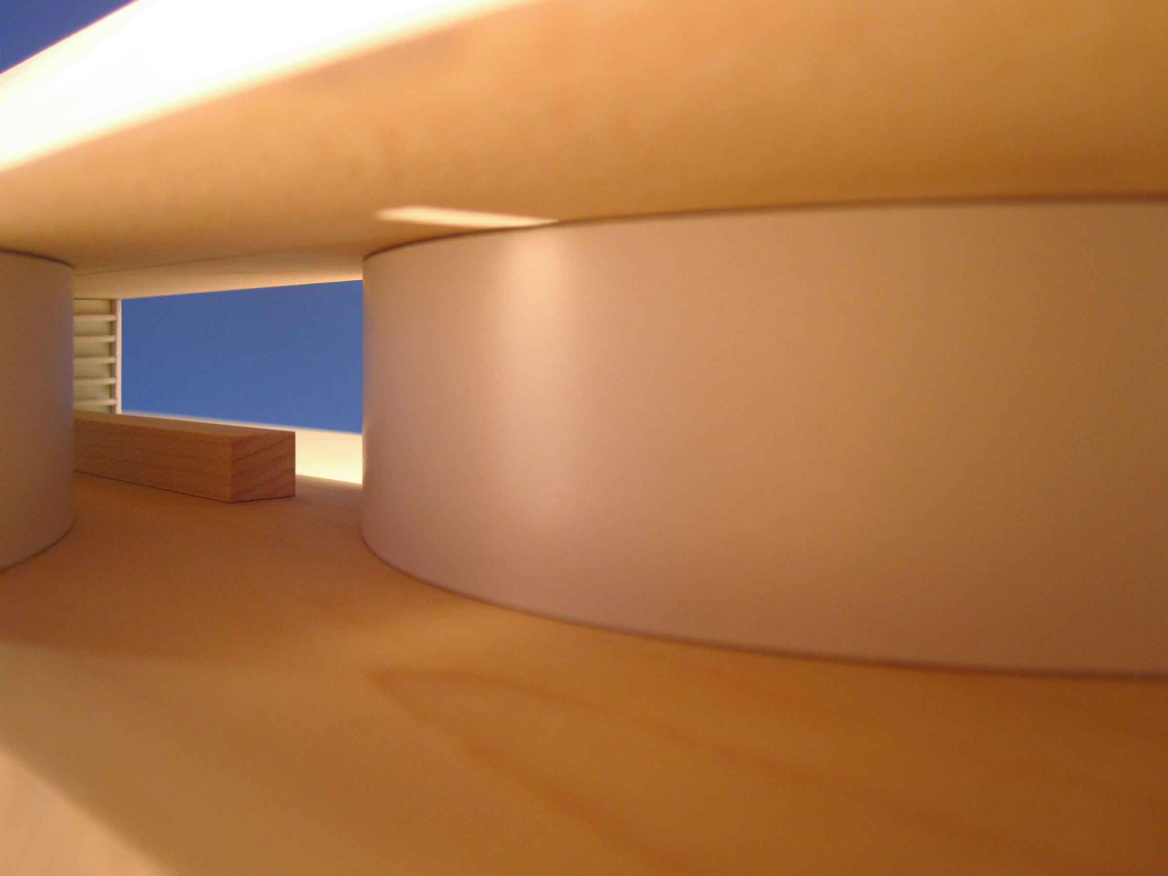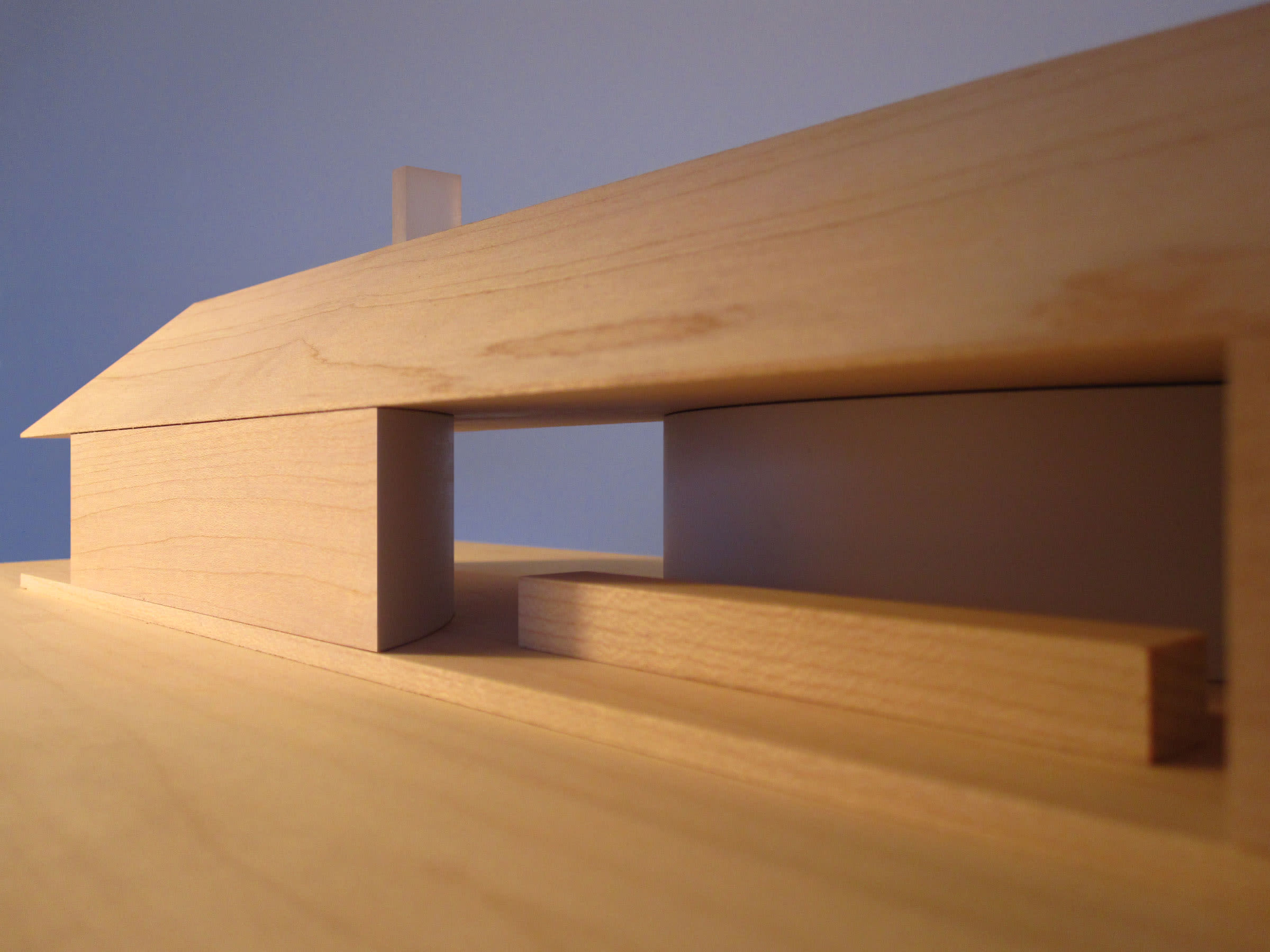 This model was made for an unbuilt project in Massachusetts. The house’s overall form referred to the old tobacco sheds of that region, and its curvilinear interior rendered a strong relationship to the surrounding field and distant trees.