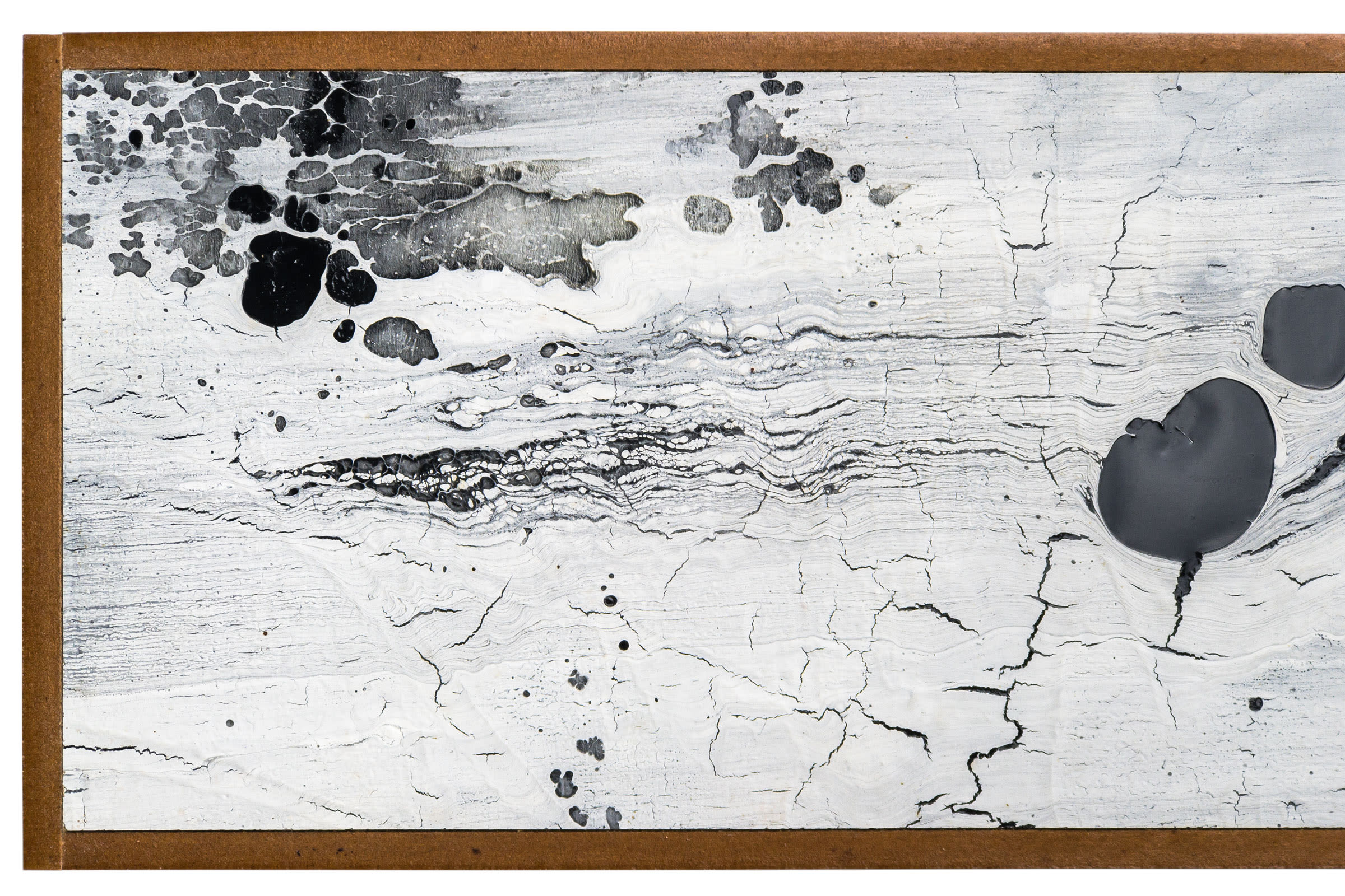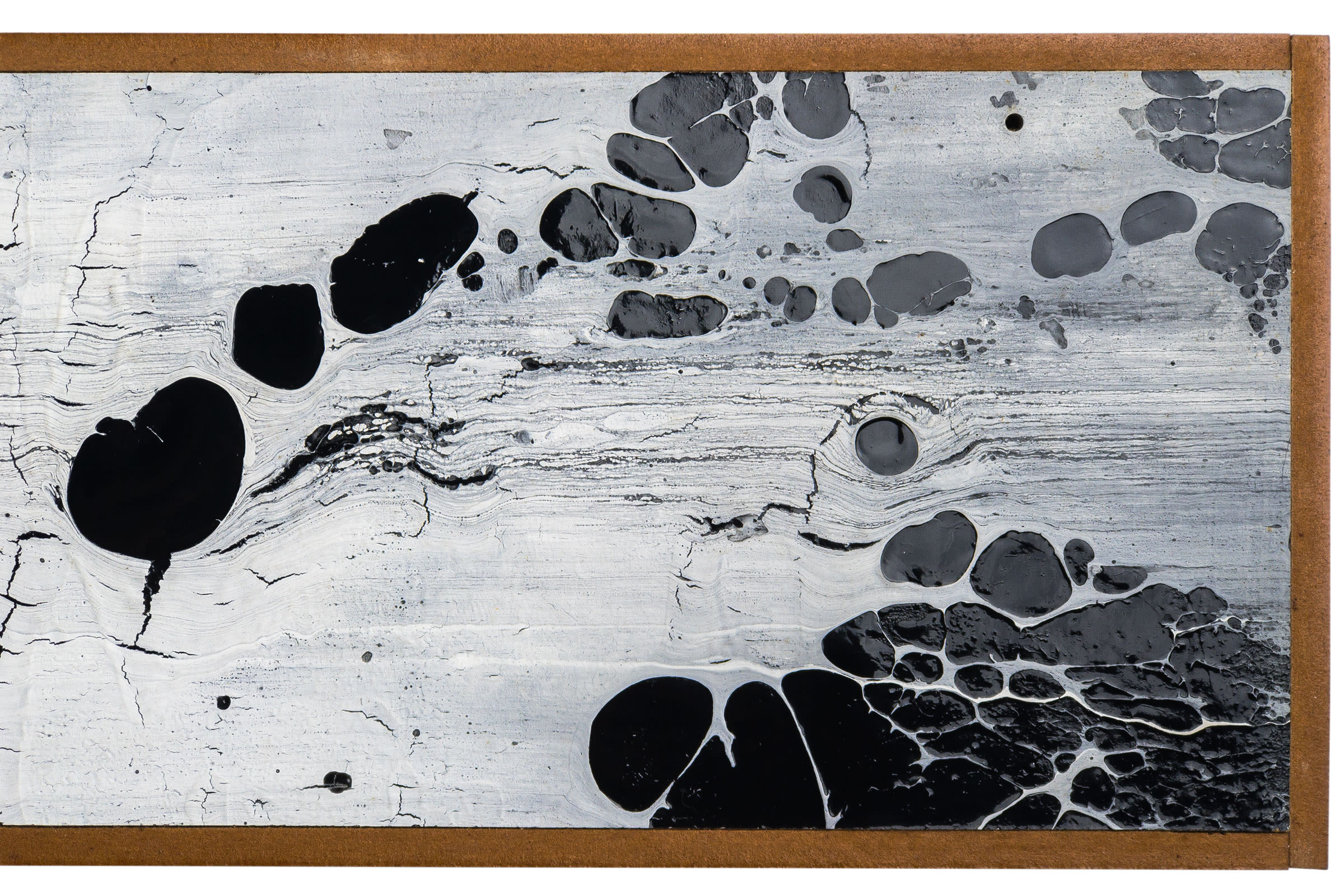 Indicative of the soul’s relationship with chance, the paint materials were chosen by the visually overt chemical reaction they had to one another. Most of the paint was applied with the work lying flat, increasing each paint material’s exposure to the next. Now and then, the painting would be variably tilted, allowing gravity to visibly affect the mixture of the paint.