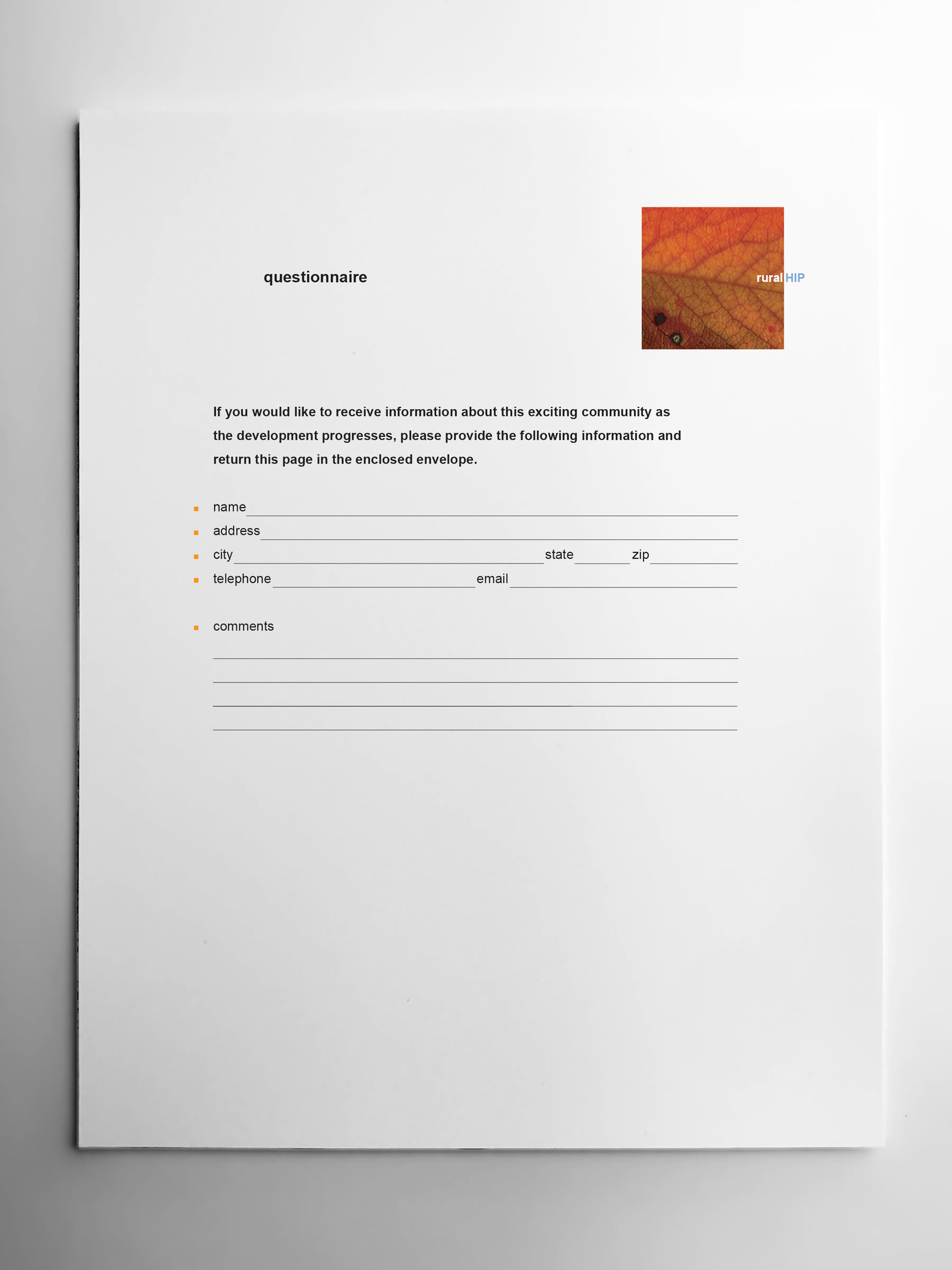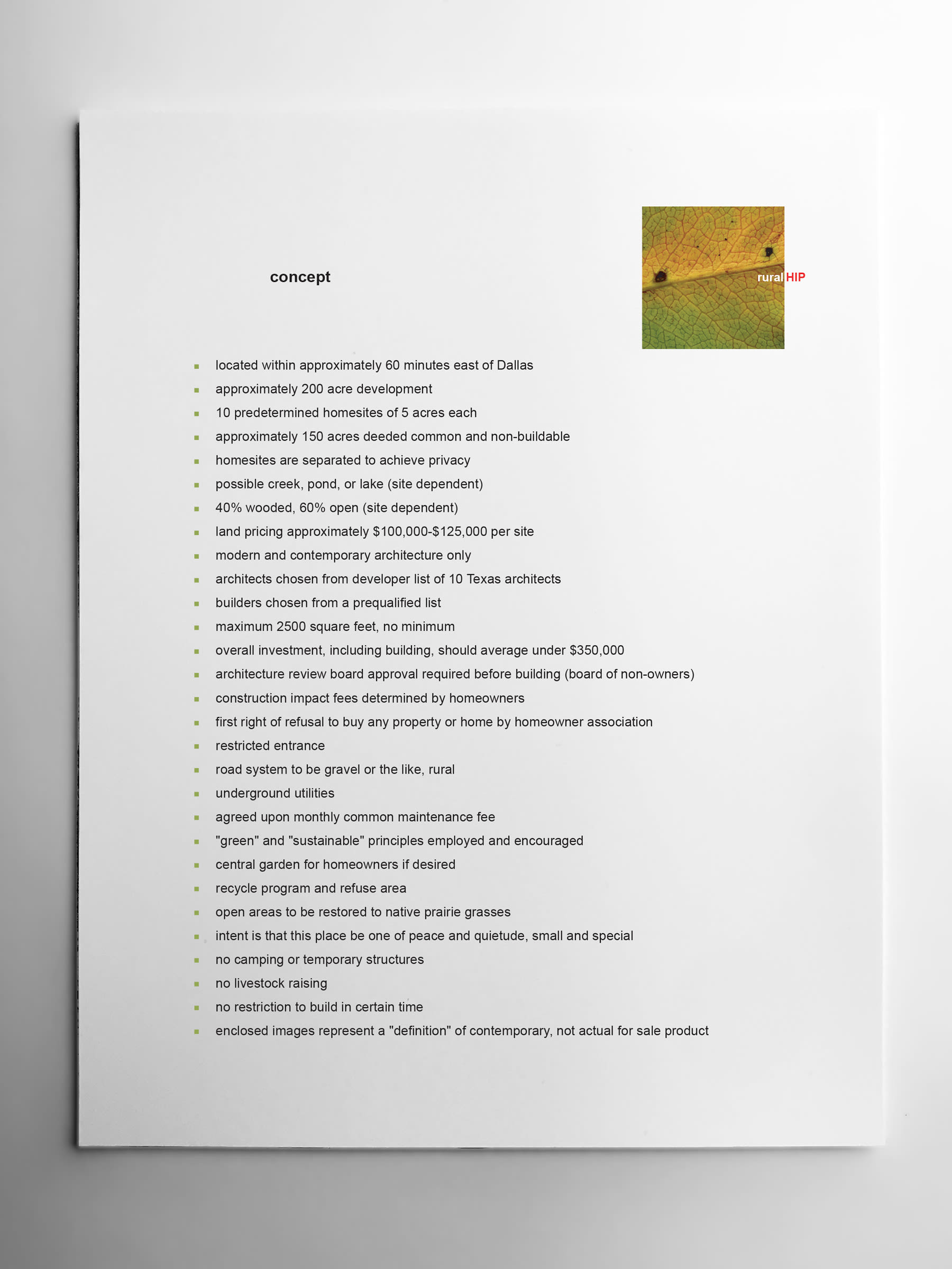 In the spring of 2004, I was nearing graduation from architecture school when I received my first commissioned graphic design project. At the time Max Levy Architect and a developer were in the early stages of planning an avant-garde ‘housing edition’. The new development was called Rural Hip, and its premise was modest pieces of modernism set on generous rural plots a little ways outside of Dallas. The charge of the project for me was to generate brand identity including a logo and mailer packet to probe outside interest.