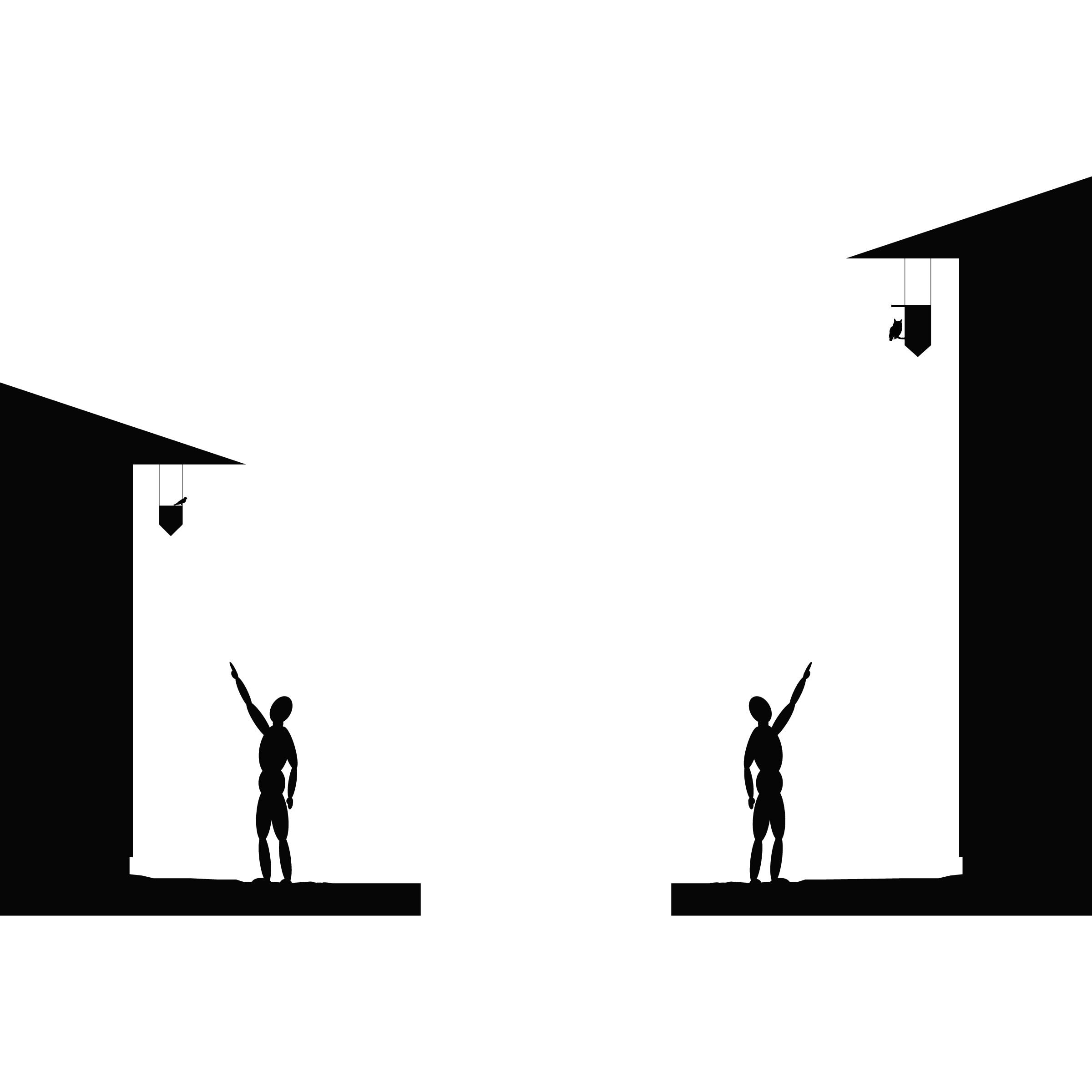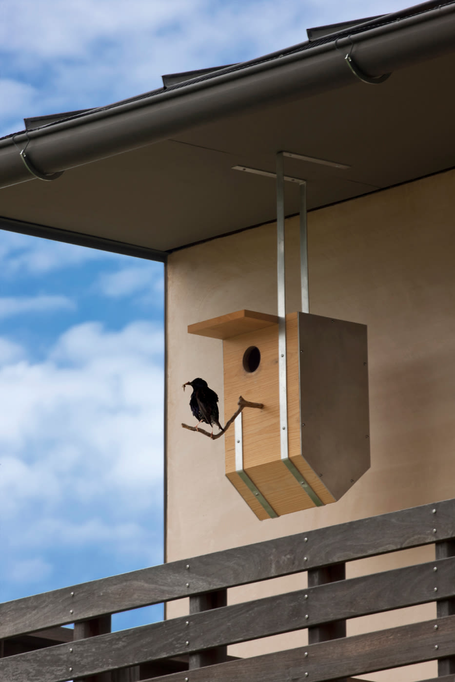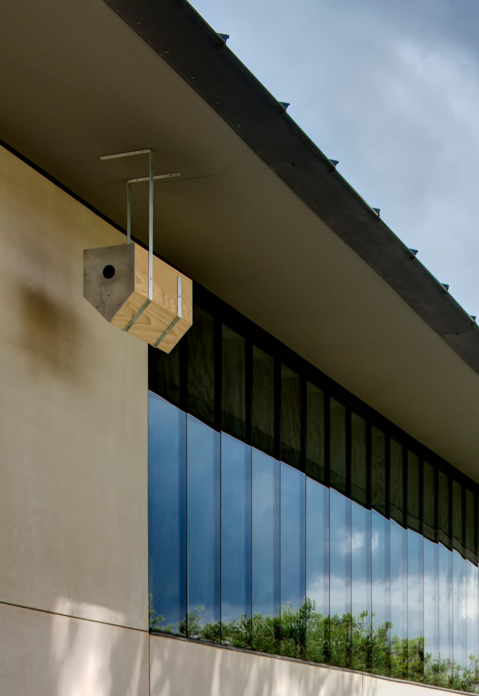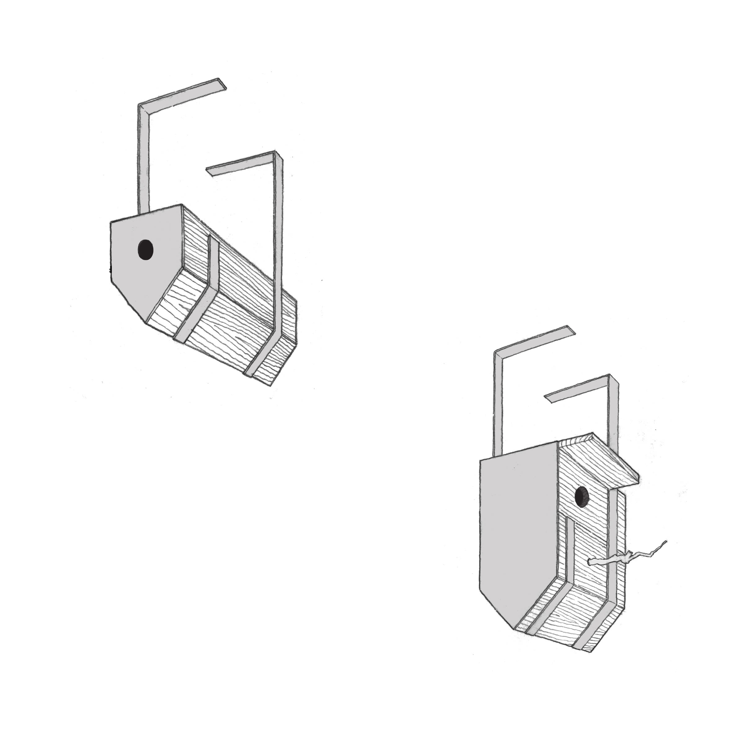 The upside-down gabled boxes express their function by alluding to the birds’ defiance of gravity. In addition, this form more readily hangs from the house’s soffits, cradles the birds inside, and lets out any interior moisture.
